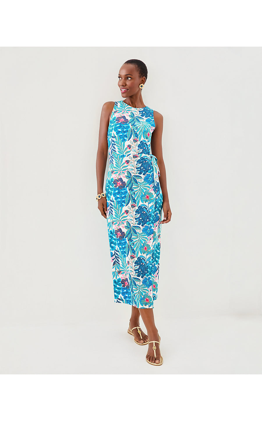 - Fitted midi dress with a front wrap skirt and functional tie.