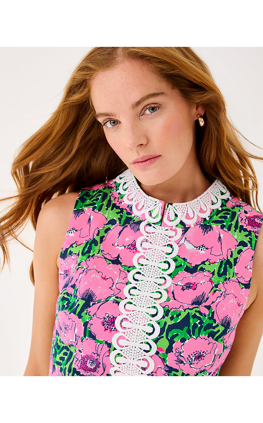 - Straight fit shift dress with a stand collar, side panels with a front slit detail, and Lilly lace trim.