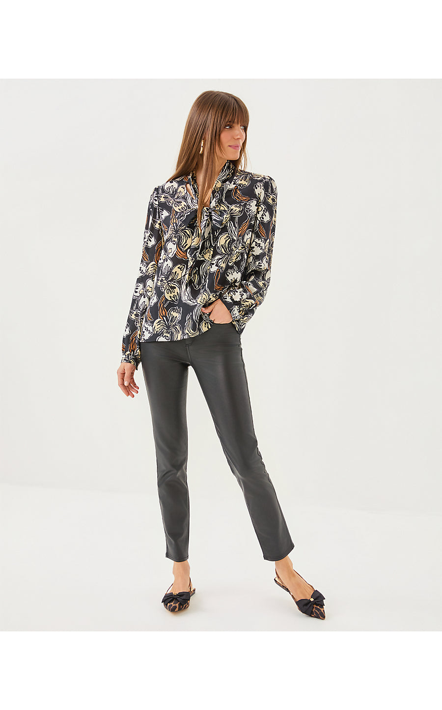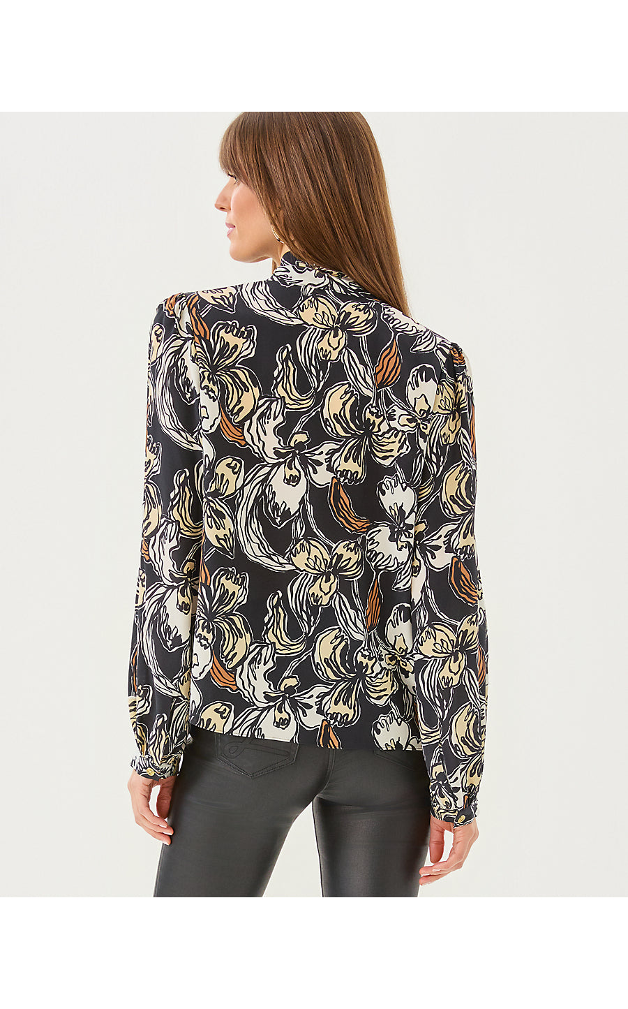 Elanor V-Neck Silk Top- Straight fit, v-neck, long sleeve top with a scarf bow neck detail.