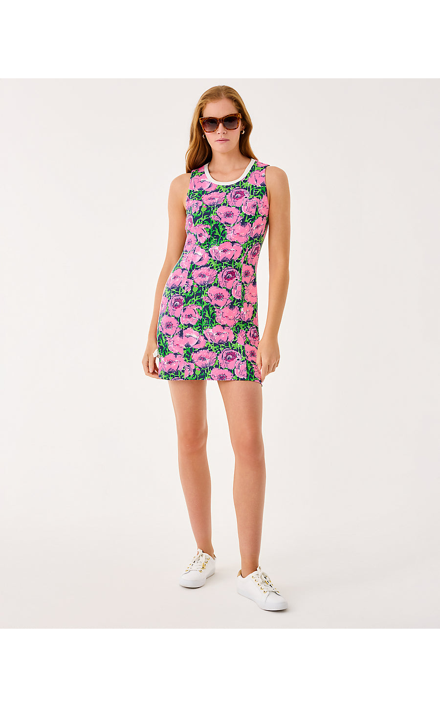 - UPF 50+ Luxletic® active dress with a built-in bra and removable cups. This style also features side slits with bows and undershorts with a pocket.