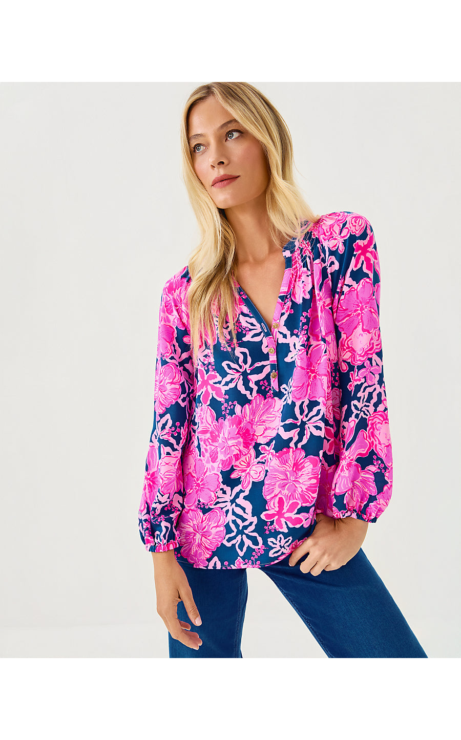 • Easy fit, pullover blouse with gold buttons and bracelet-length sleeves.