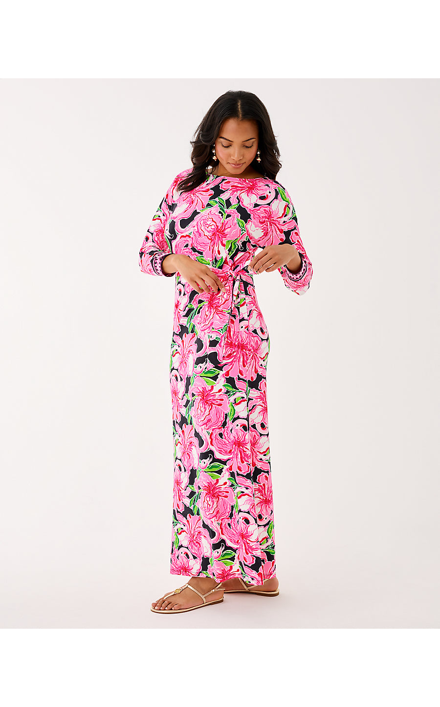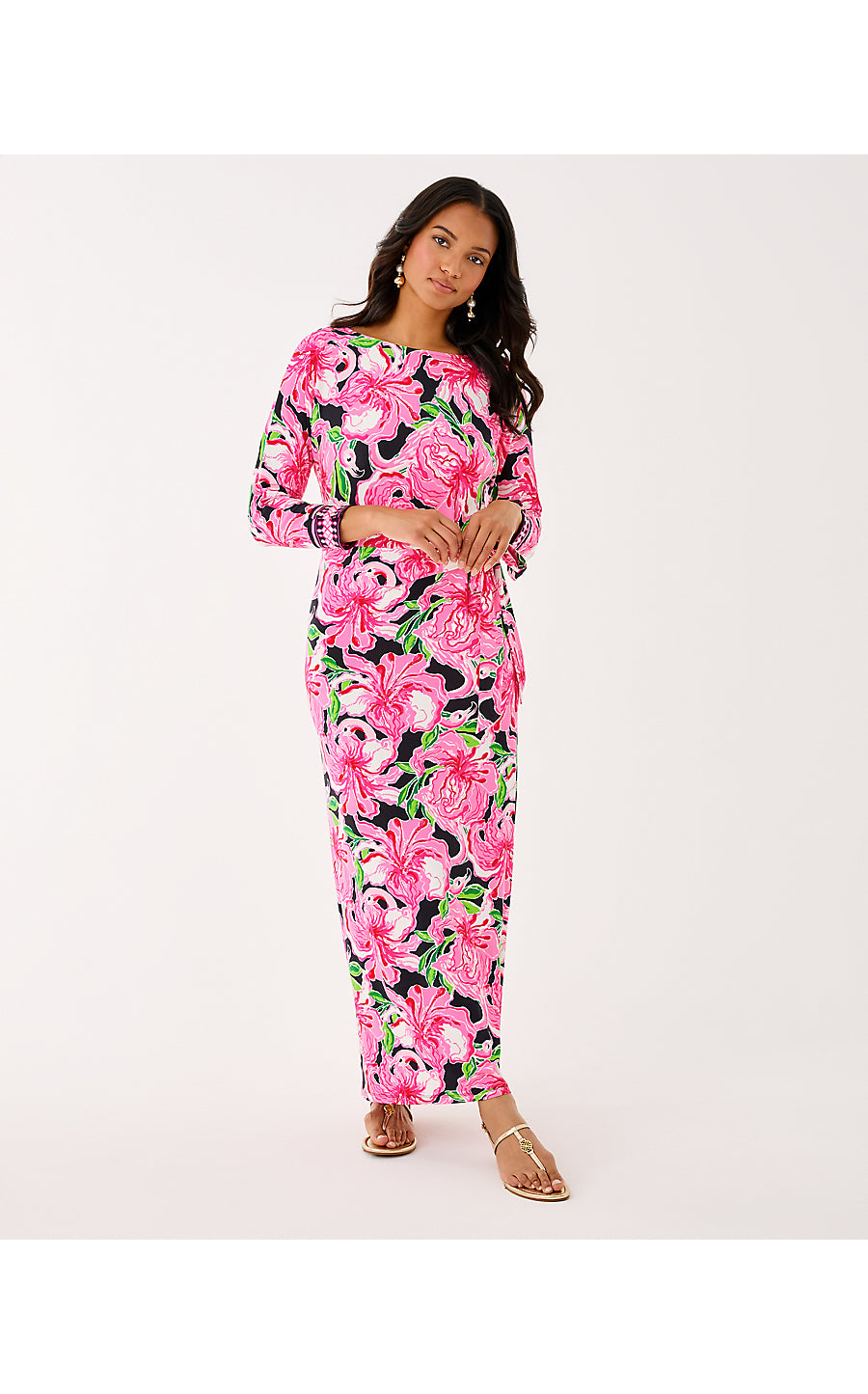 - Fitted, boatneck maxi dress with long dolman sleeves.