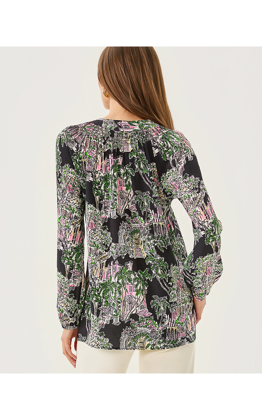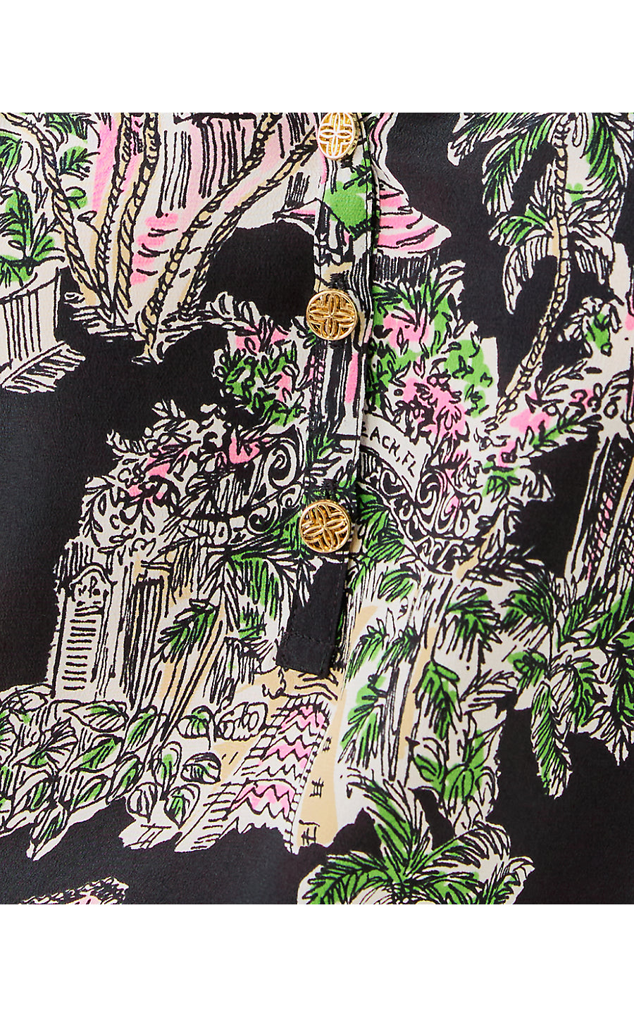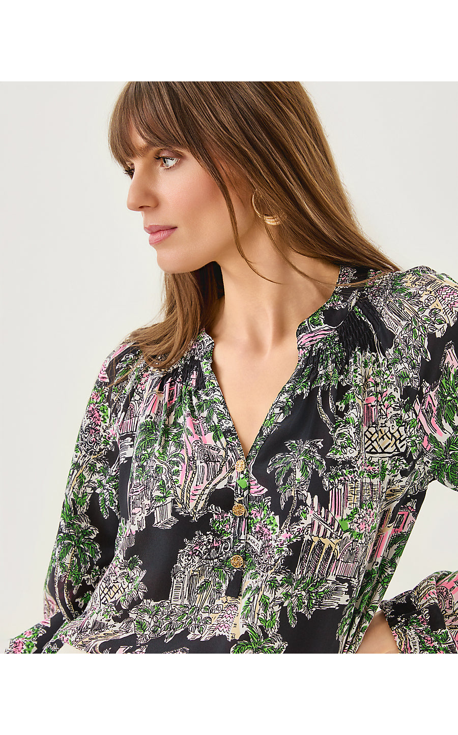 • Easy fit, pullover blouse with gold buttons and bracelet-length sleeves.