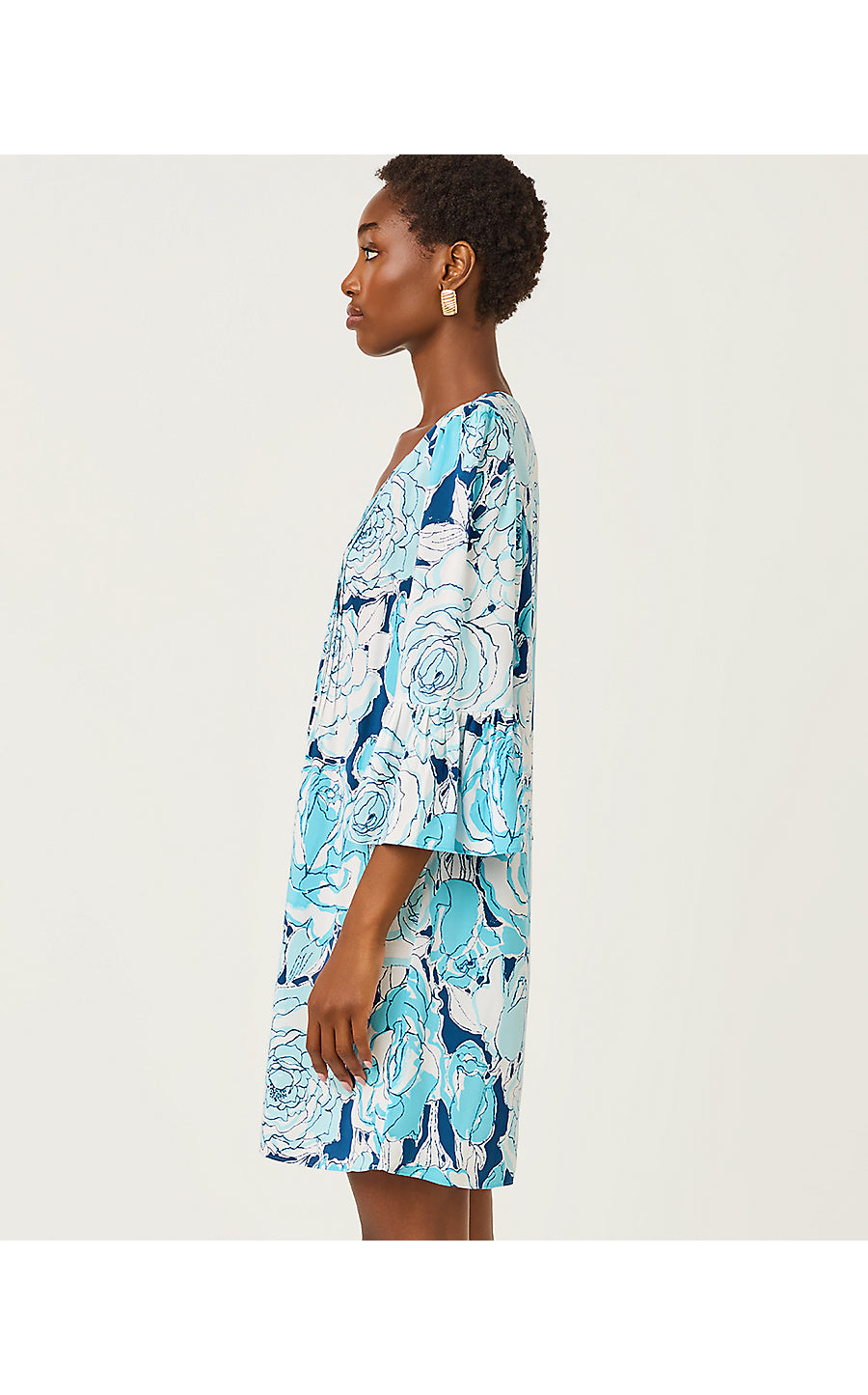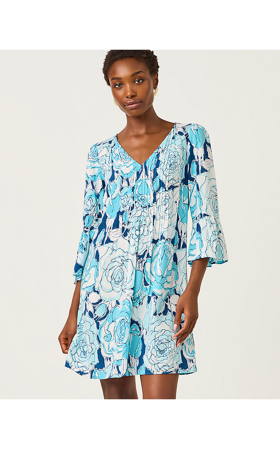 • Easy fit, v-neck dress with pintuck details and 3/4 length ruffle-hem sleeves.