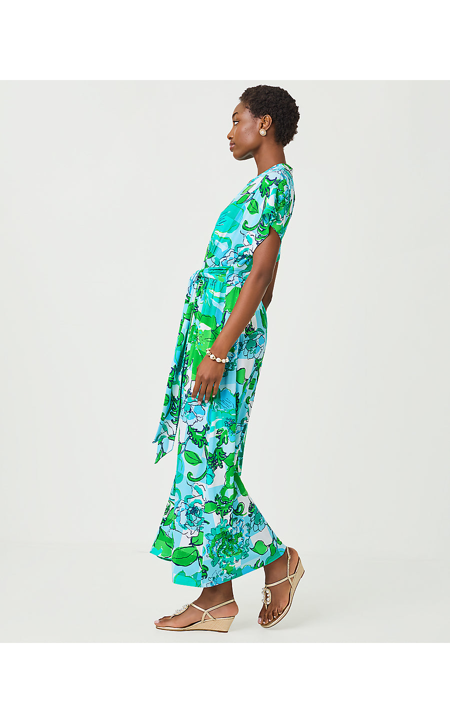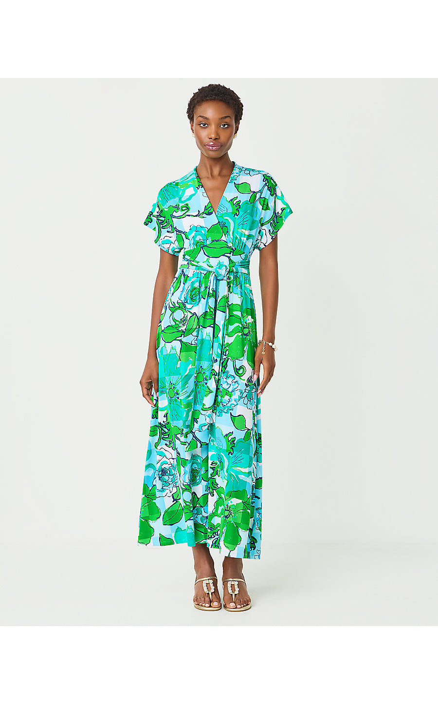 • Fit-and-flare maxi dress with a surplice bodice, short kimono sleeves, and a wrap waist sash detail.