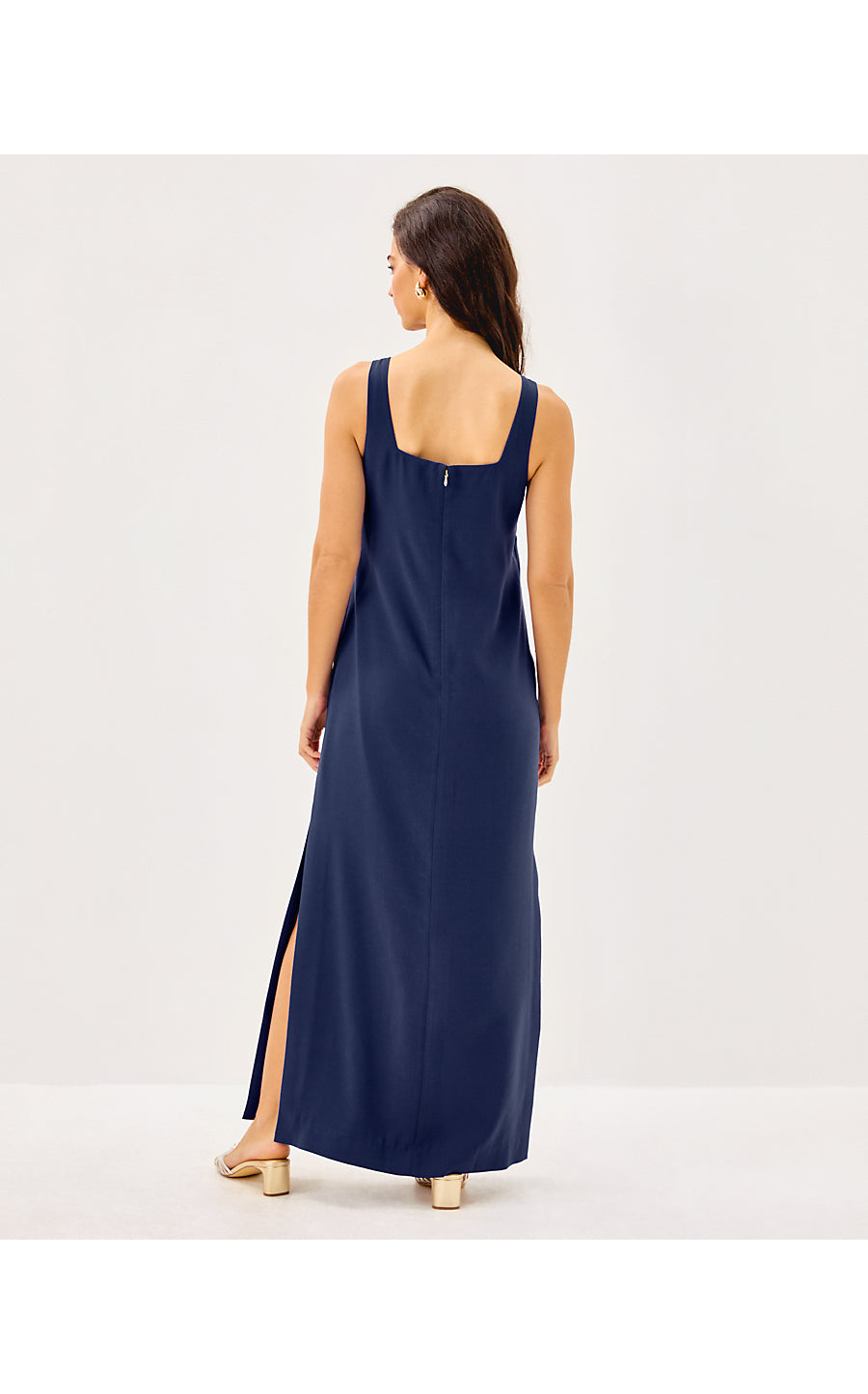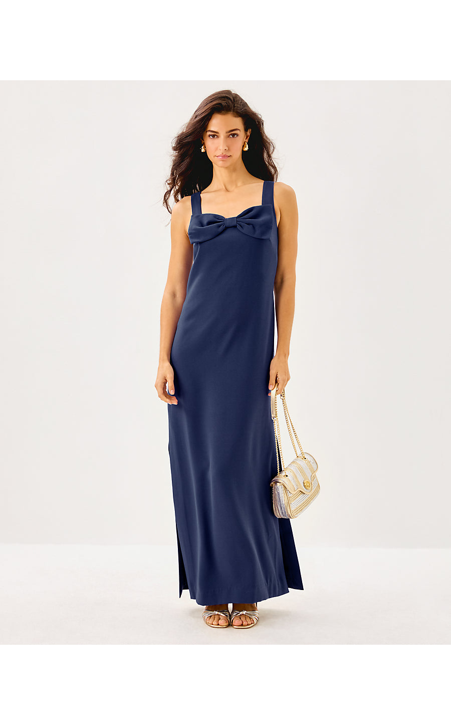 - Straight fit maxi dress with a large bow at the front neckline and side slits.