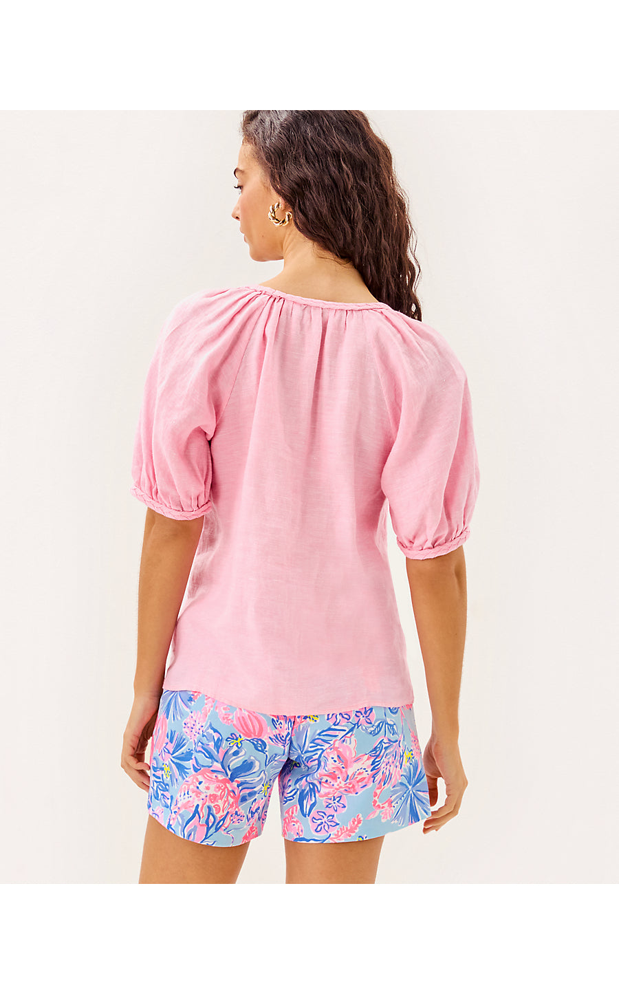 • Easy fit top with a shirred v-neckline, braid details, and raglan sleeves.