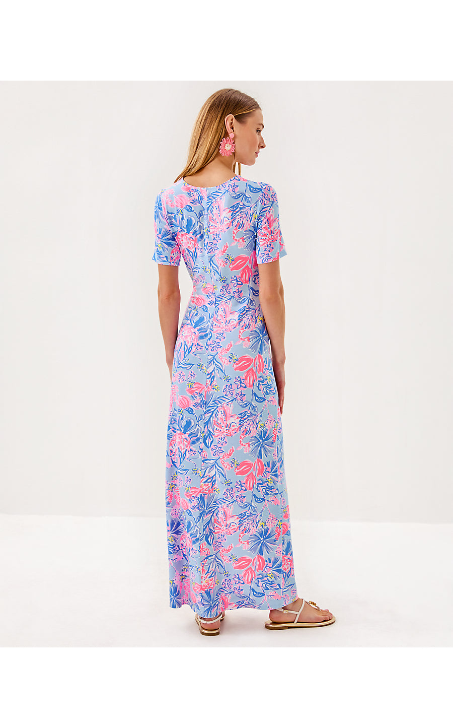 - Fitted, short sleeve, maxi dress with a crew neckline, side slit, and functional tie detail at the waist.