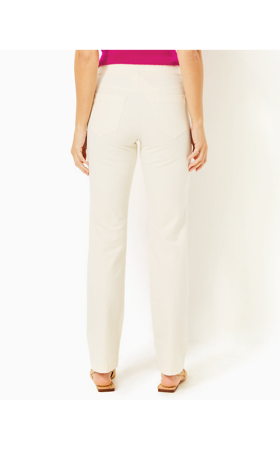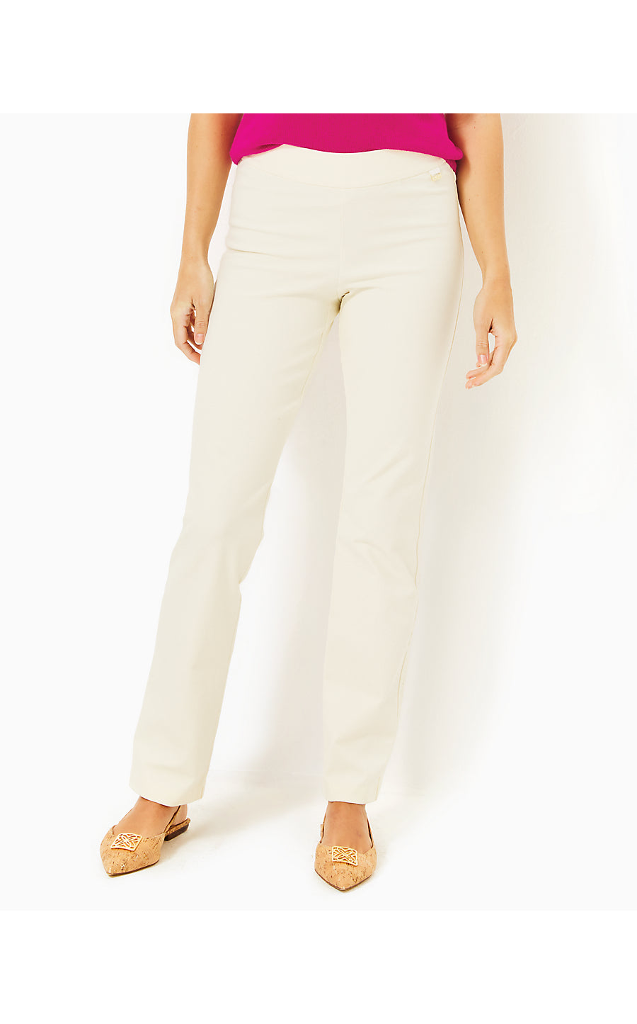 - High rise, pull-on pant with a straight leg. Blind hemmed to give you your perfect length.