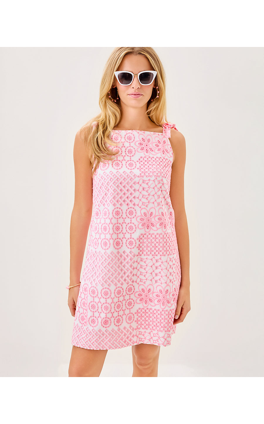 - Straight fit shift dress with an apron neckline, bow detail at the shoulders, and side panels.
