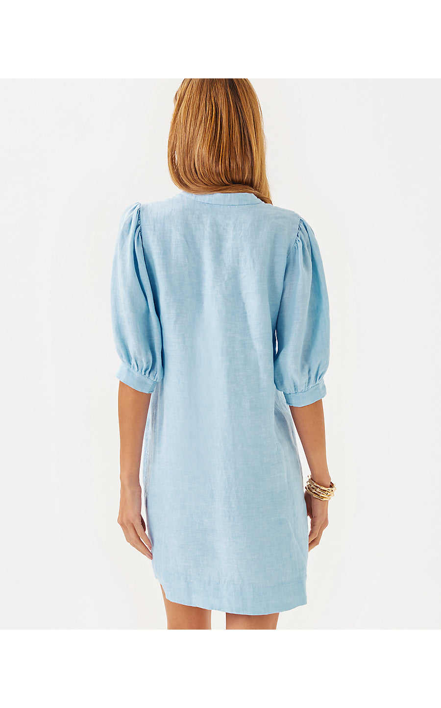 • Easy fit, popover dress with a stand collar, half placket, and elbow-length puff sleeves.