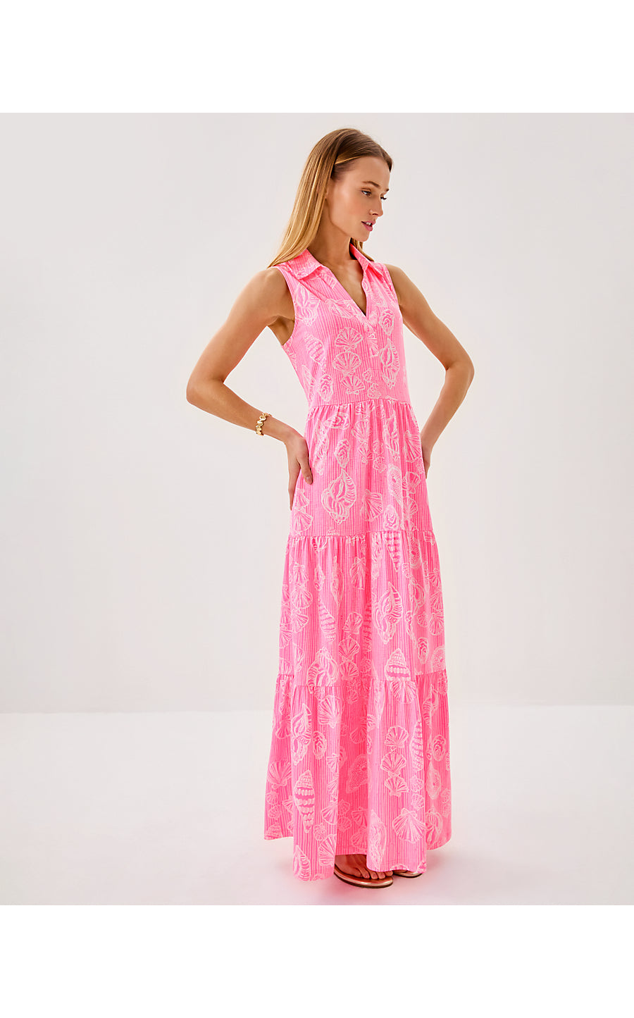 - Swing fit, tiered maxi dress with a collar and half placket.