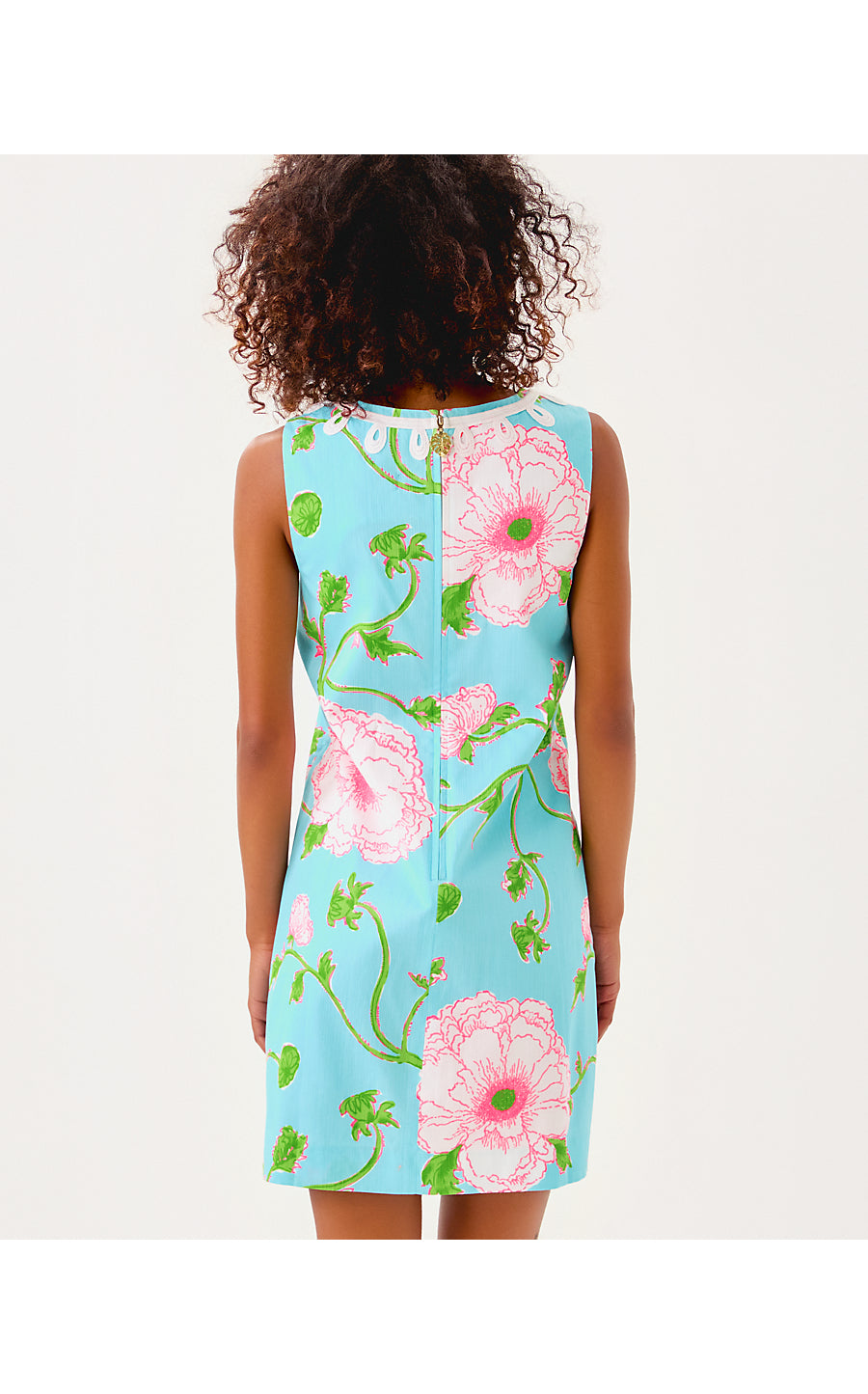 - Straight fit, v-neck shift dress with patch pockets and Lilly lace trim.
