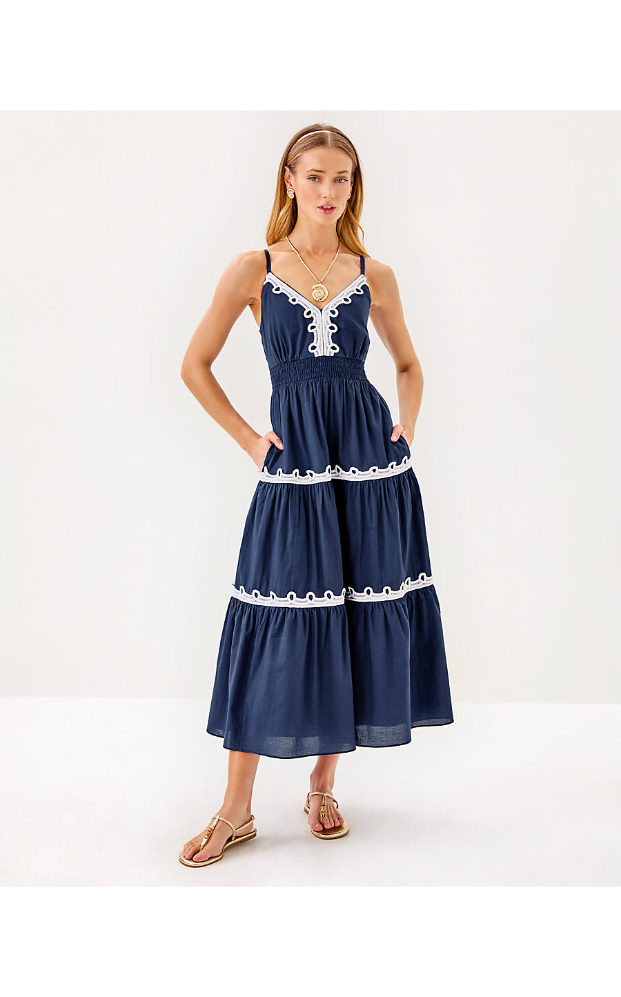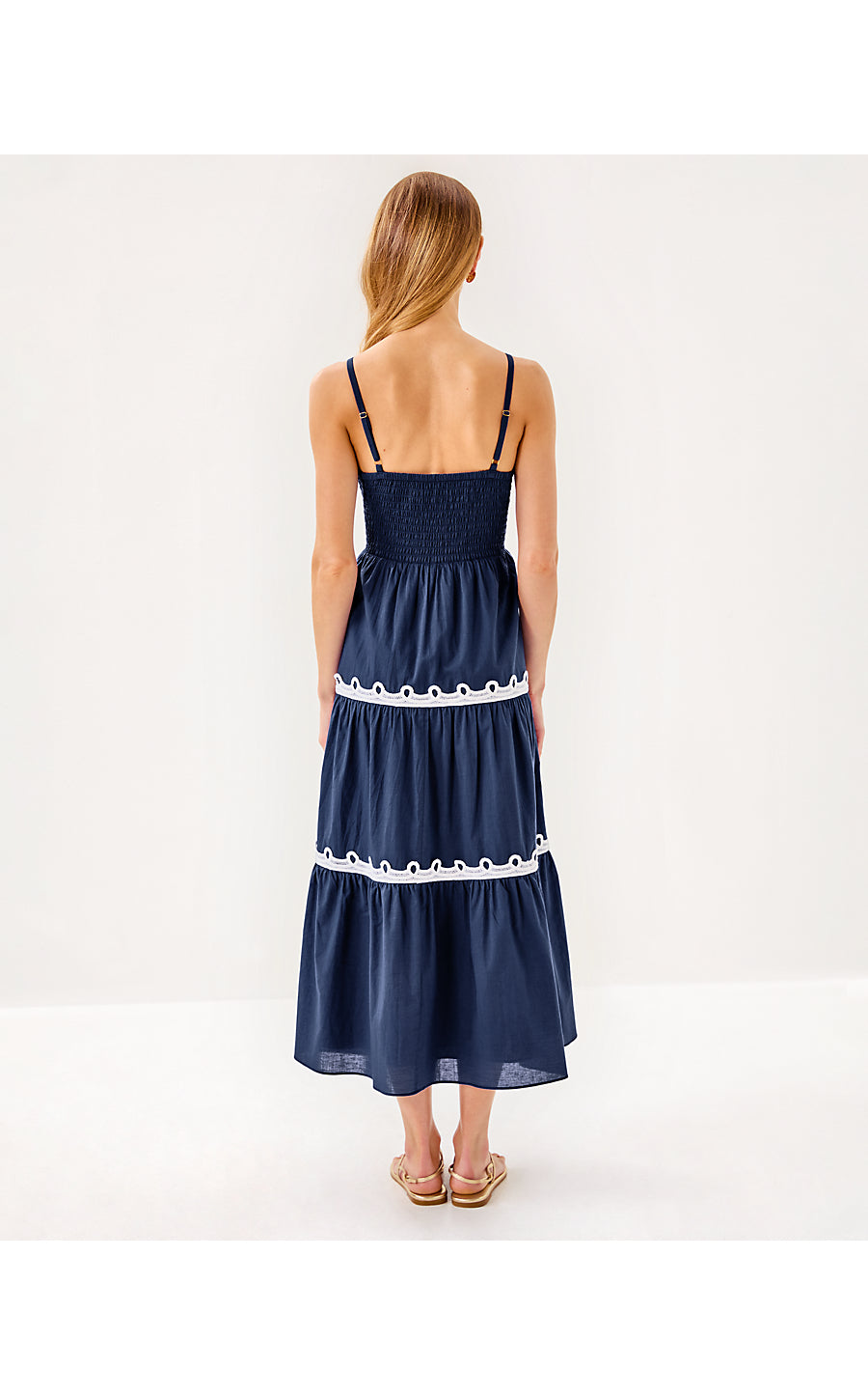 - Fit-and-flare midi dress with adjustable spaghetti straps, bodice cups, and a smocked waistband and back panel. This style also features a tiered skirt and side seam pockets.