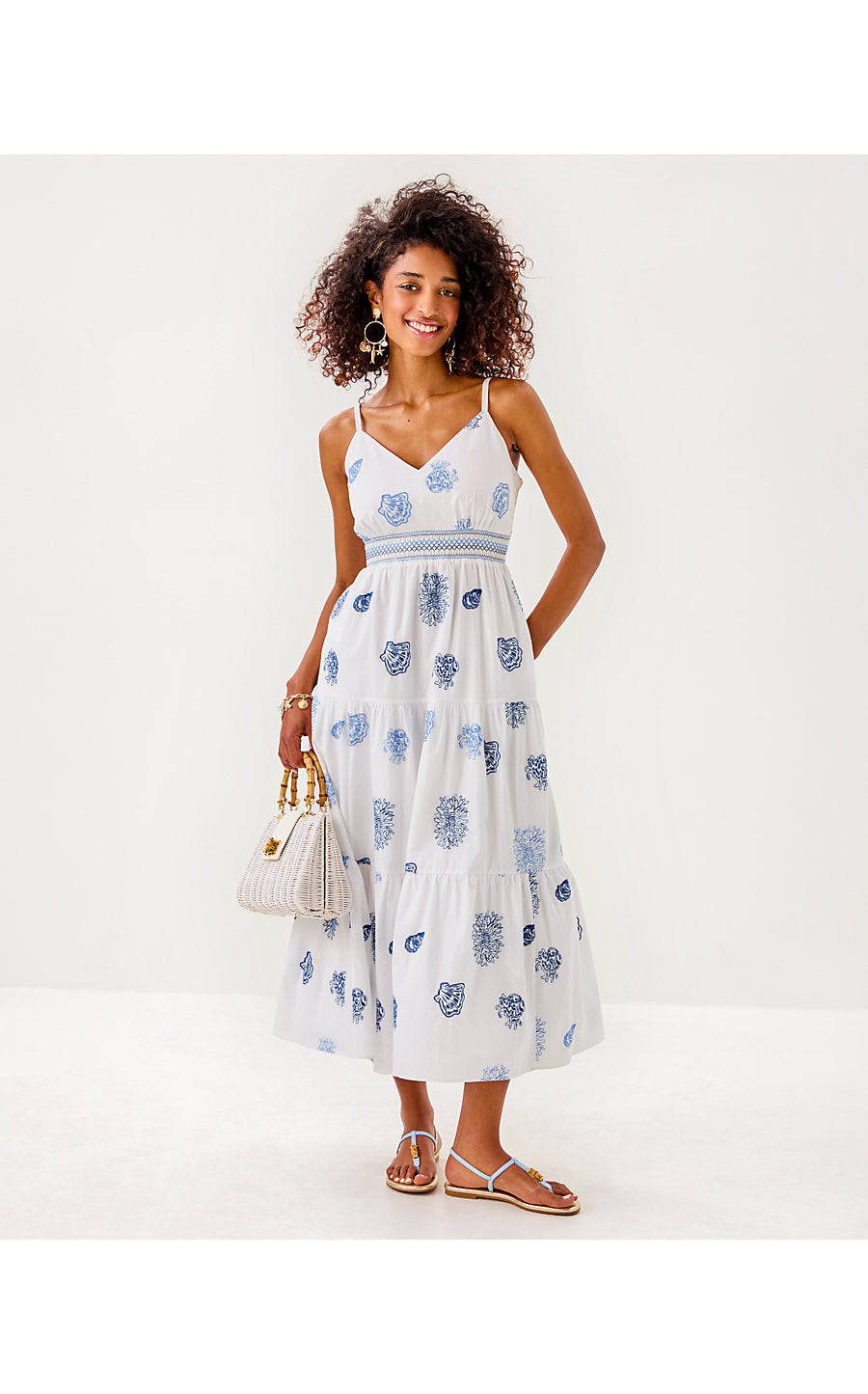 - Fit-and-flare, embroidered midi dress with adjustable spaghetti straps, bodice cups, and smocking at the waistband and back panel. This style also features a tiered skirt and side seam pockets.