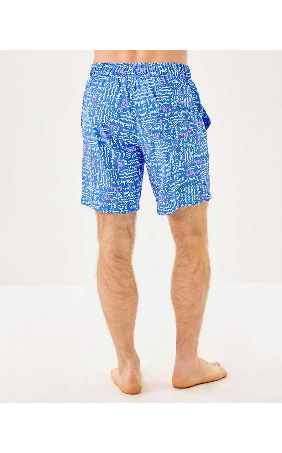 - Boxer-style swim trunk with an elastic & drawstring waist and a mesh boxer liner.