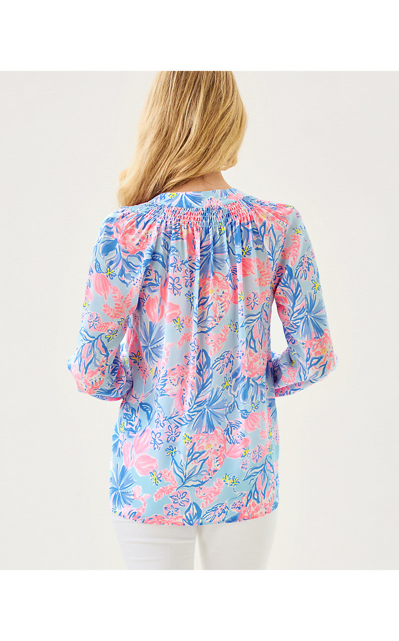A tried-and-true wardrobe staple, our Elsa Silk Top can be dressed up or down. Pair with jeans, leggings, shorts, or a skirt to make this elegant pullover top your own.- Easy fit, pullover blouse with gold buttons and bracelet-length sleeves.