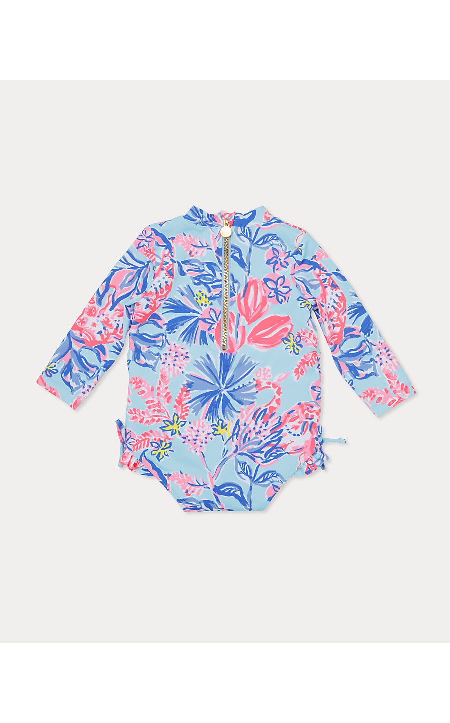 - UPF 50+ infant one-piece rashguard swimsuit with long sleeves, a back zipper, and ruffle details. This style also features a snap opening and lining.