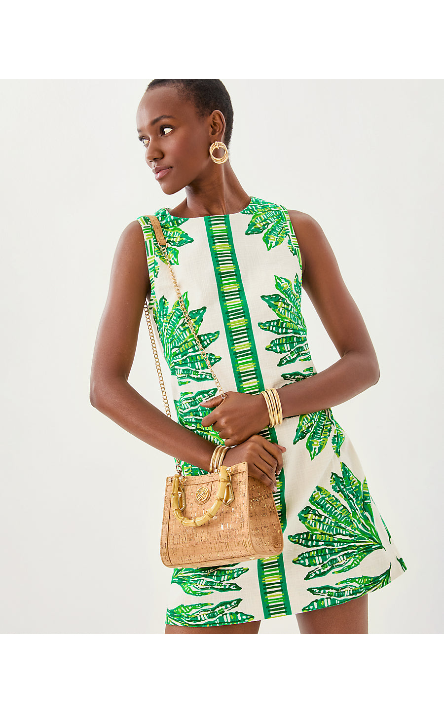 - Metallic cork mini bag with mirrored leather details, natural bamboo top handles, and a detachable gold metal chain crossbody strap.