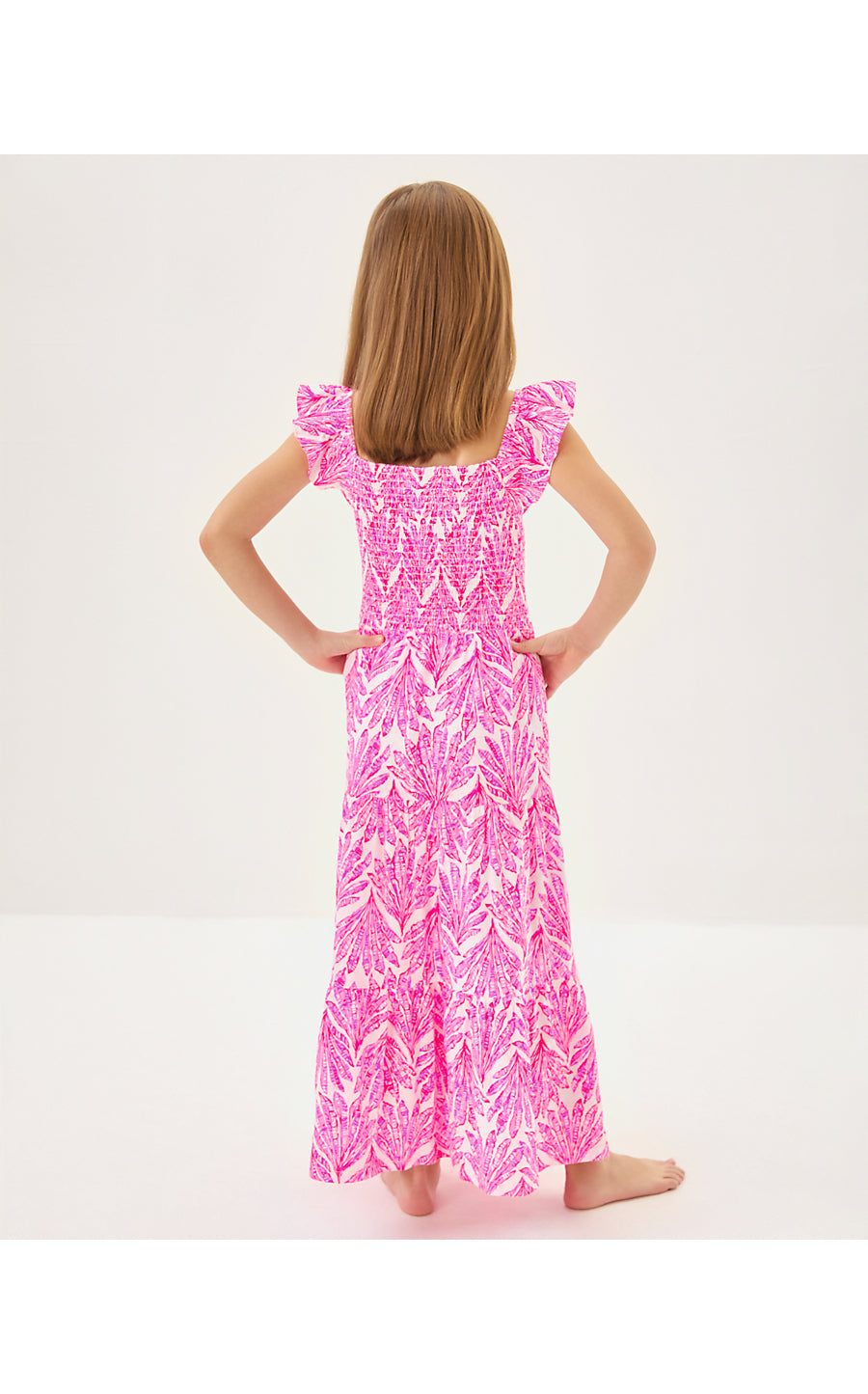 Treat your mini to some magical Lilly print in the form of our Girls Mini Jilly Midi Dress.- Midi length dress with ruffle skirt tiers, a smocked bodice, and flutter sleeve details.