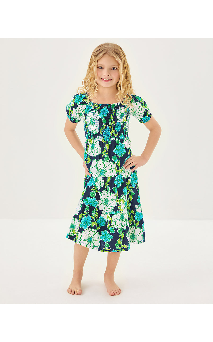 Sweet puff sleeves and a ruffle skirt will make the Girls Mini Jilly Dress a favorite in your little one's closet. This pretty midi dress is comfy, too, thanks to a smocked bodice and printed jersey fabric.