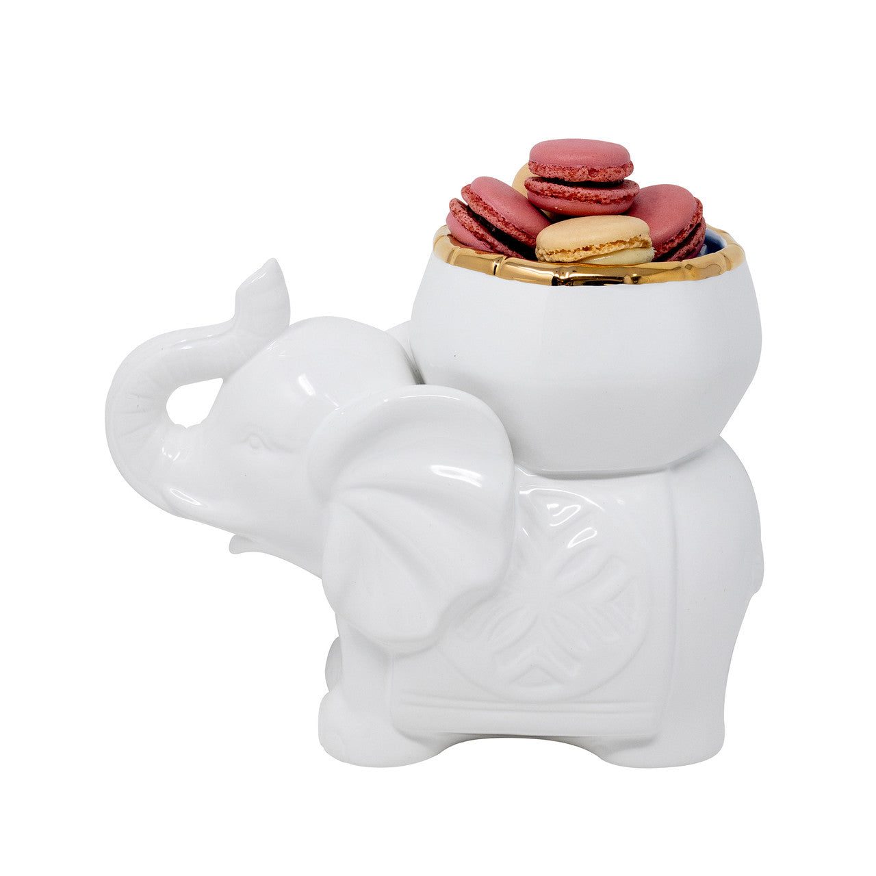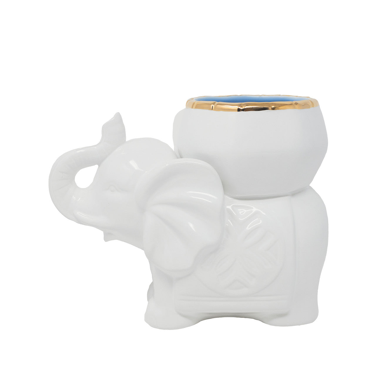 • Elephant-shaped, ceramic cachepot with gold accents.