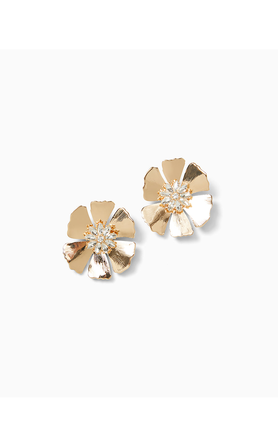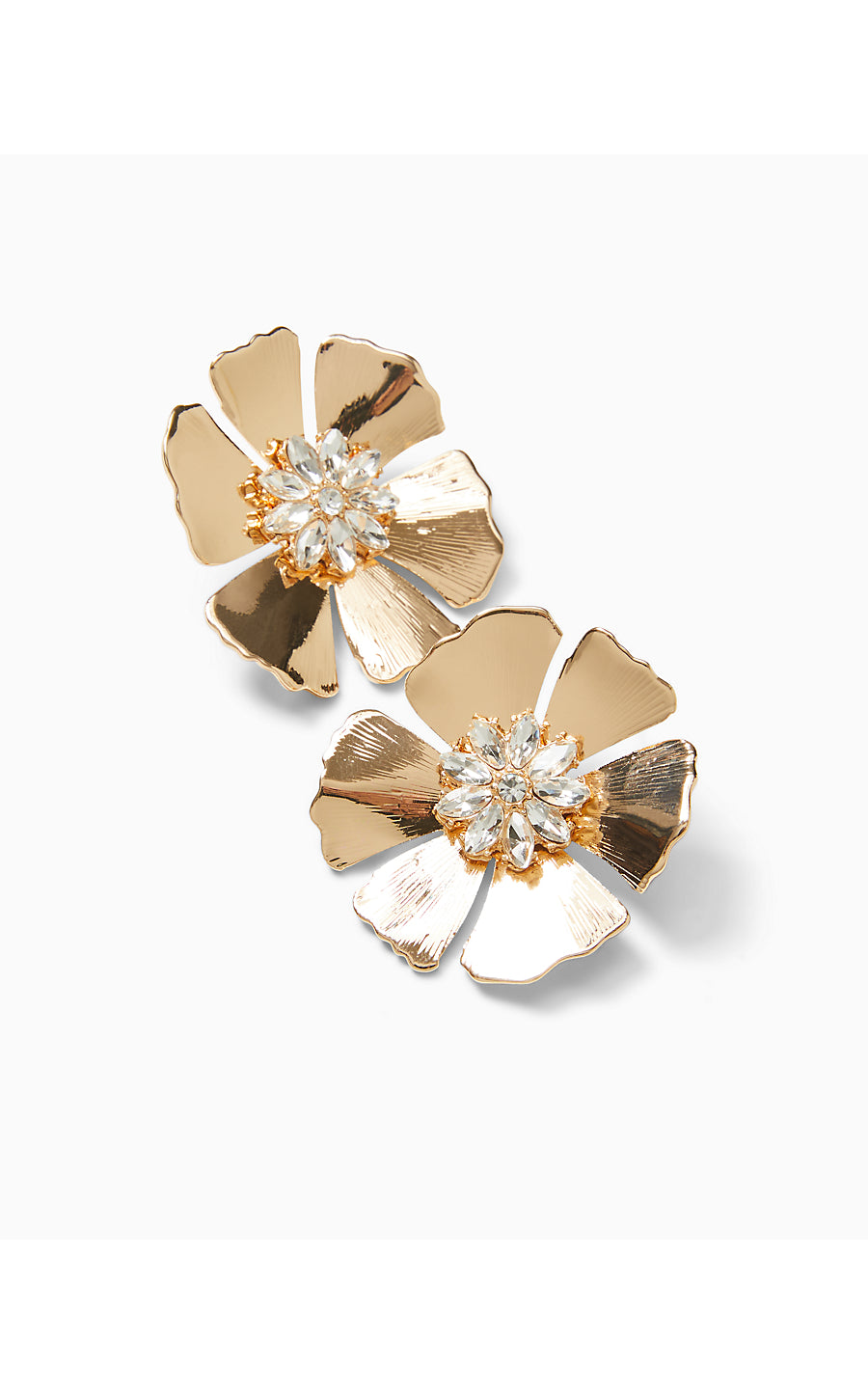 - Gold petal earrings embellished with a rhinestone center.