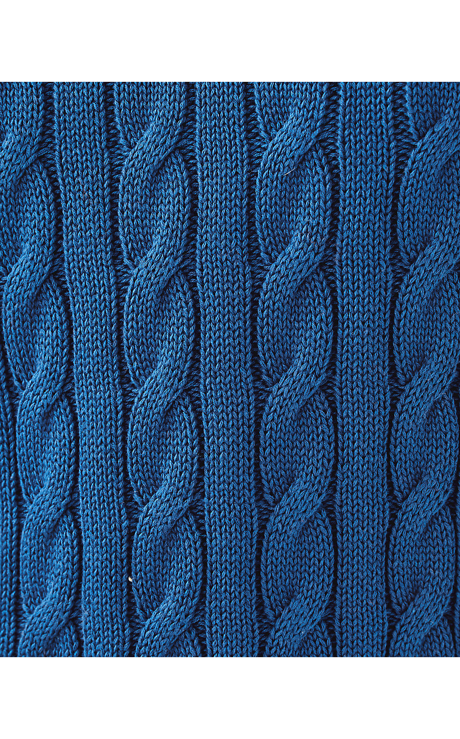 - Straight fit, high crew neck, cable sweater with striped trims.