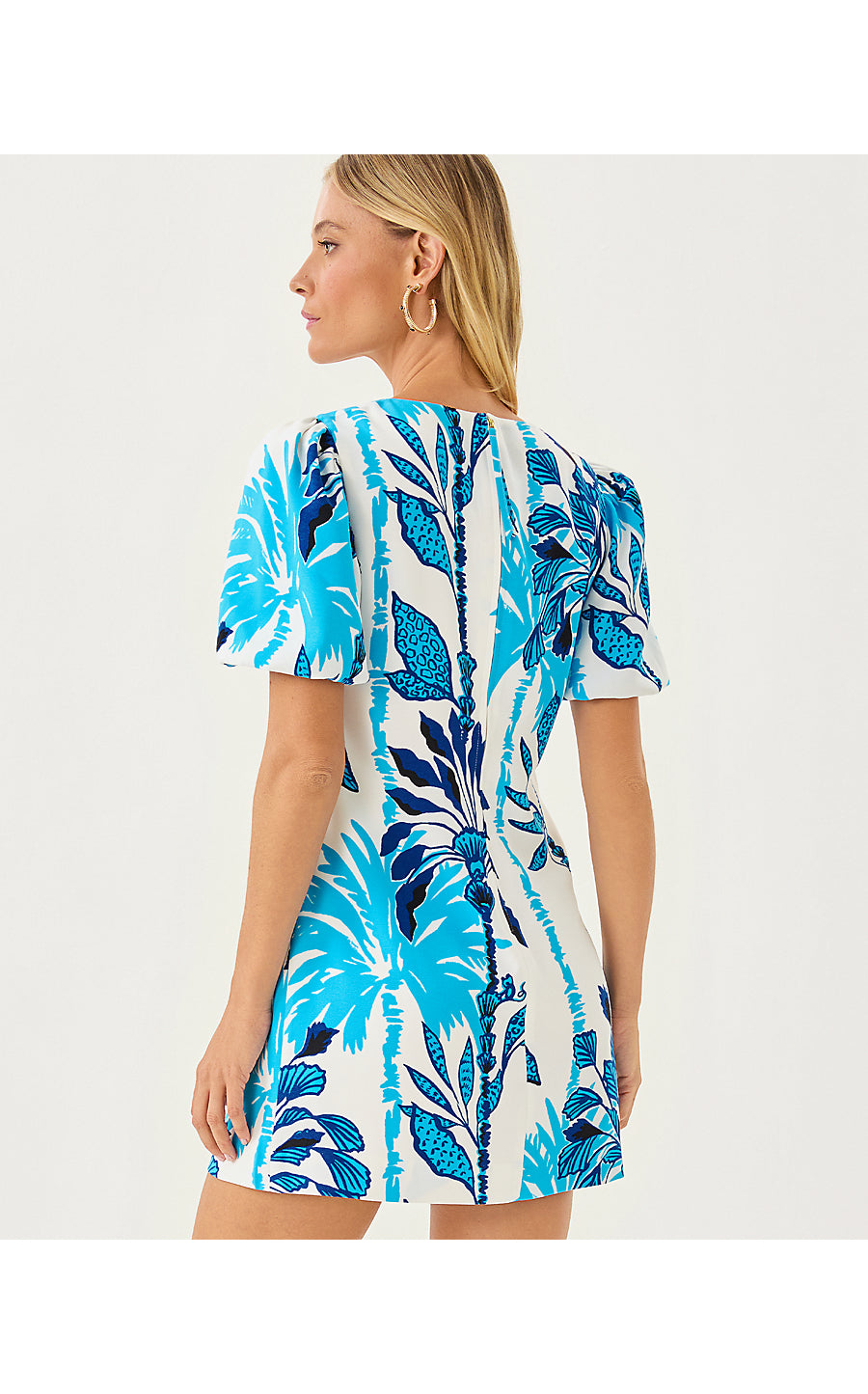• Shift romper with puff sleeves and a skirted bottom.