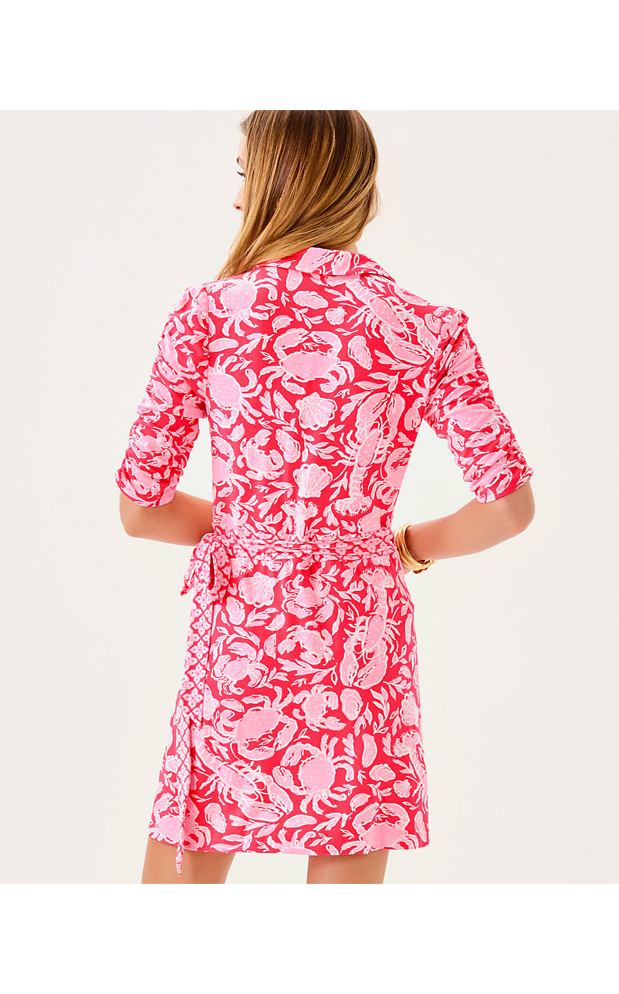 - Skirted romper with elbow-length ruched sleeves, a surplice neckline, and self tie.