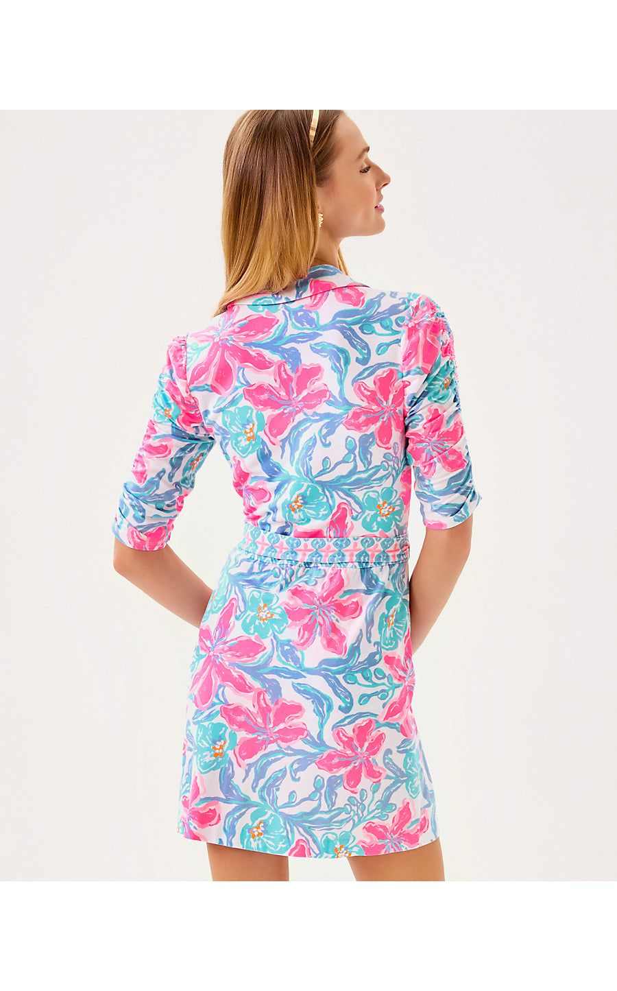 - Skirted romper with elbow-length ruched sleeves, a surplice neckline, and self tie.