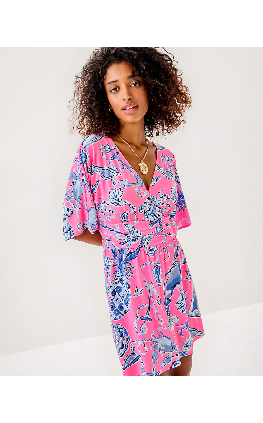- Skirted romper with a surplice neckline, elbow-length kimono sleeves, and a ruched waistband.