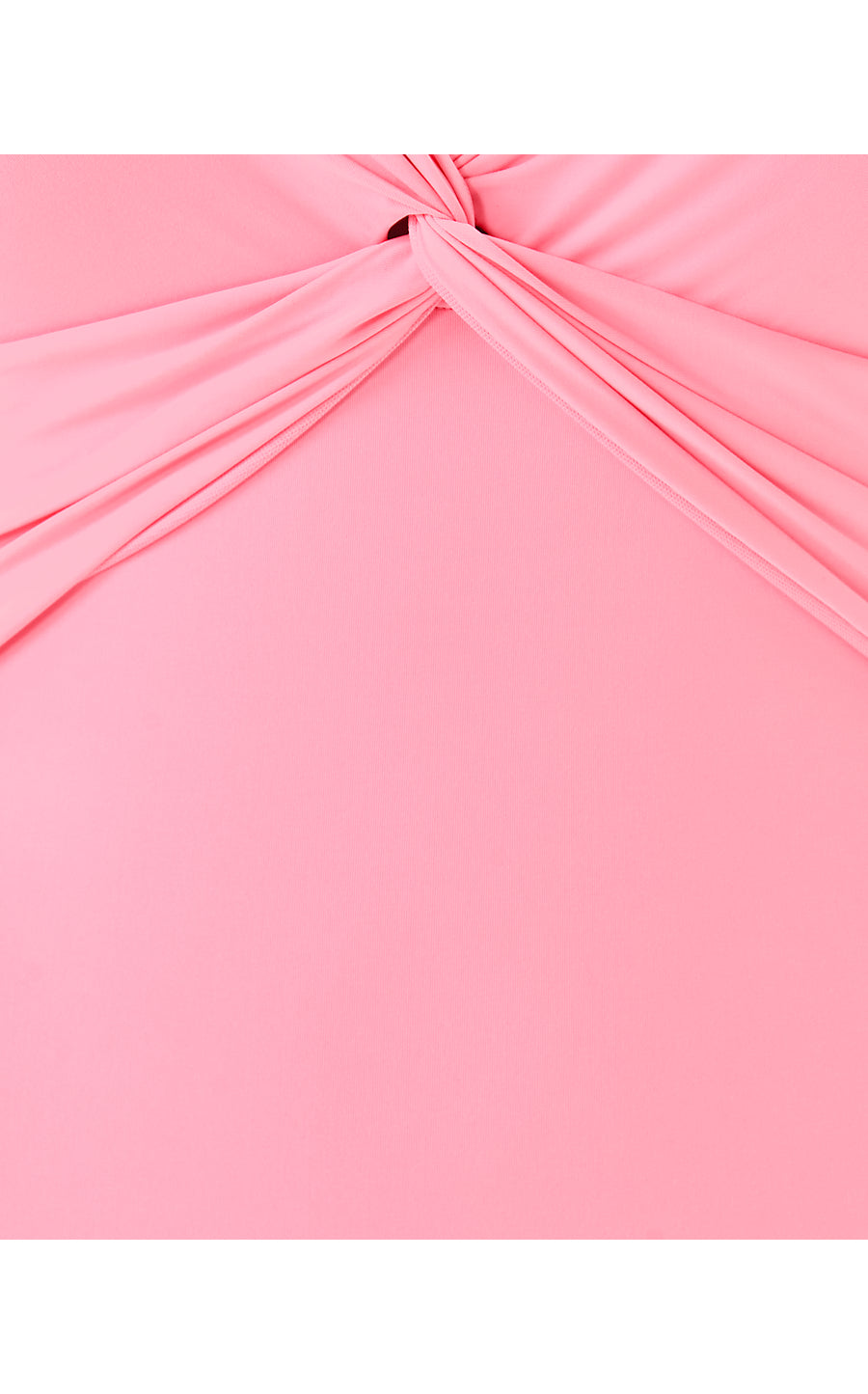 - One-piece swimsuit with ruffle shoulder detail, center twist, molded cups, and adjustable back straps.