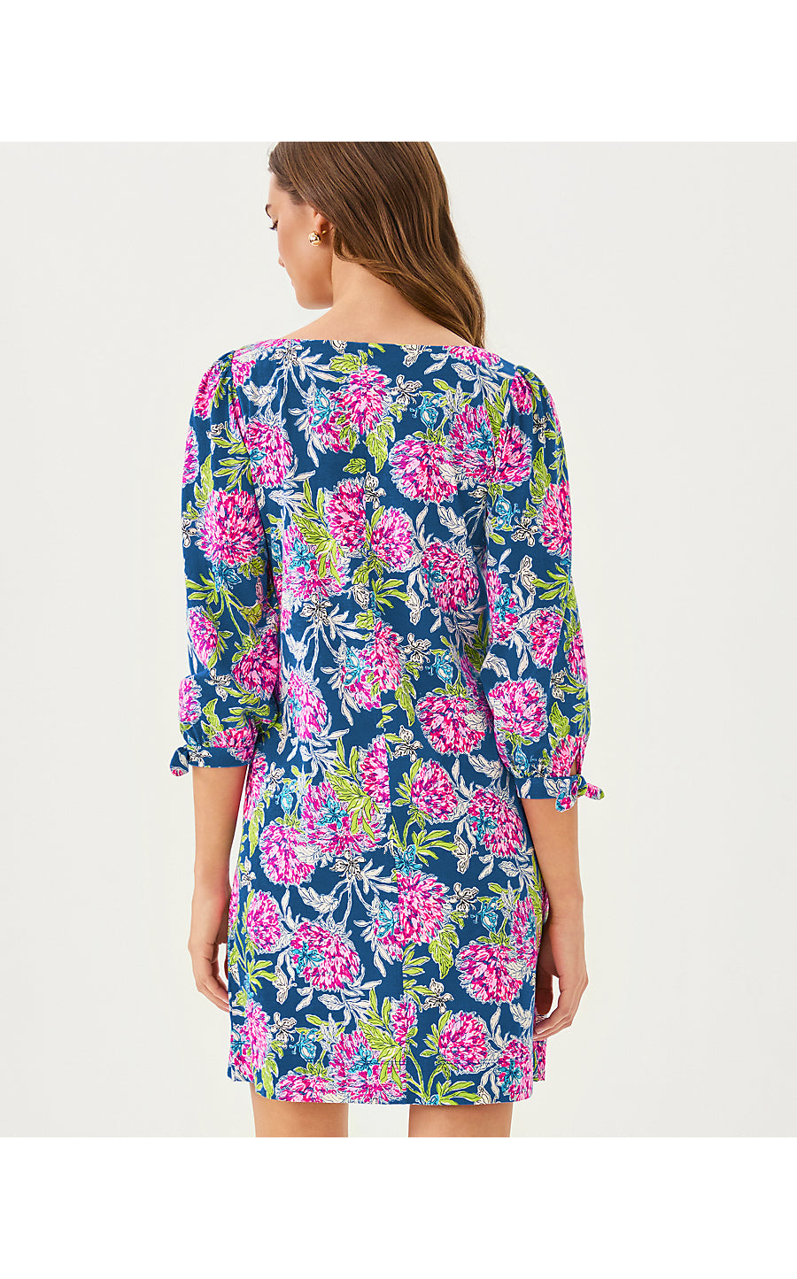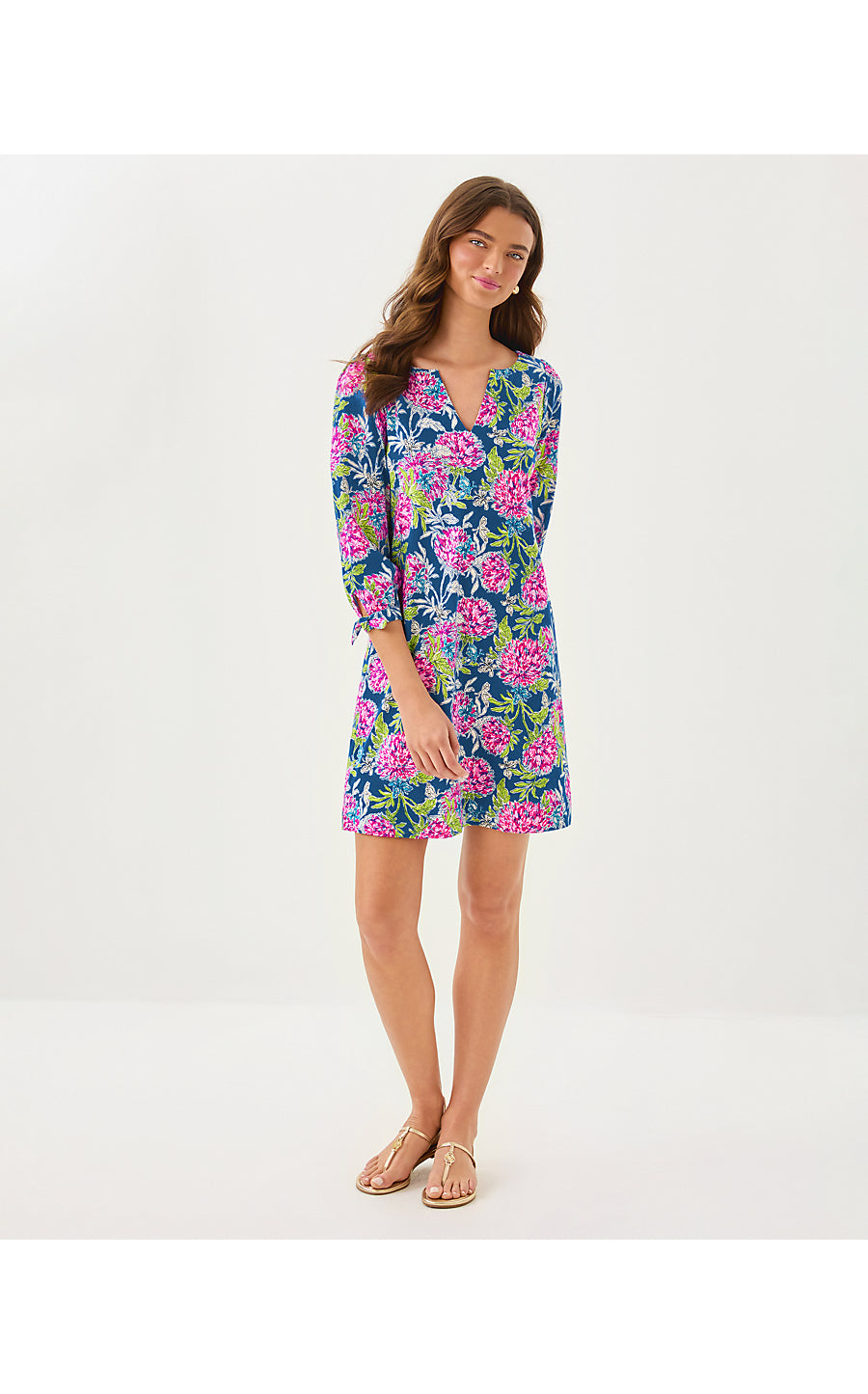 • Easy fit, 3/4 length sleeve dress with ties at the cuff and a notch neckline.