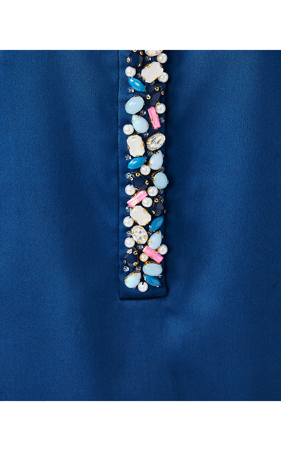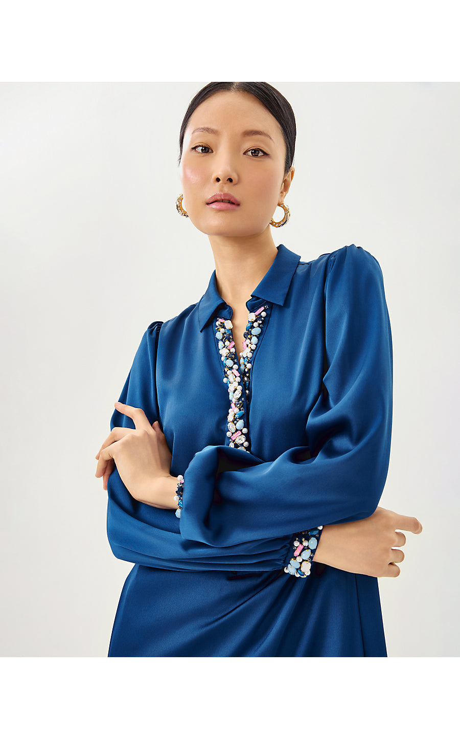 - Straight fit, long sleeve, collared shirtdress with side panels, pockets, and beaded details.