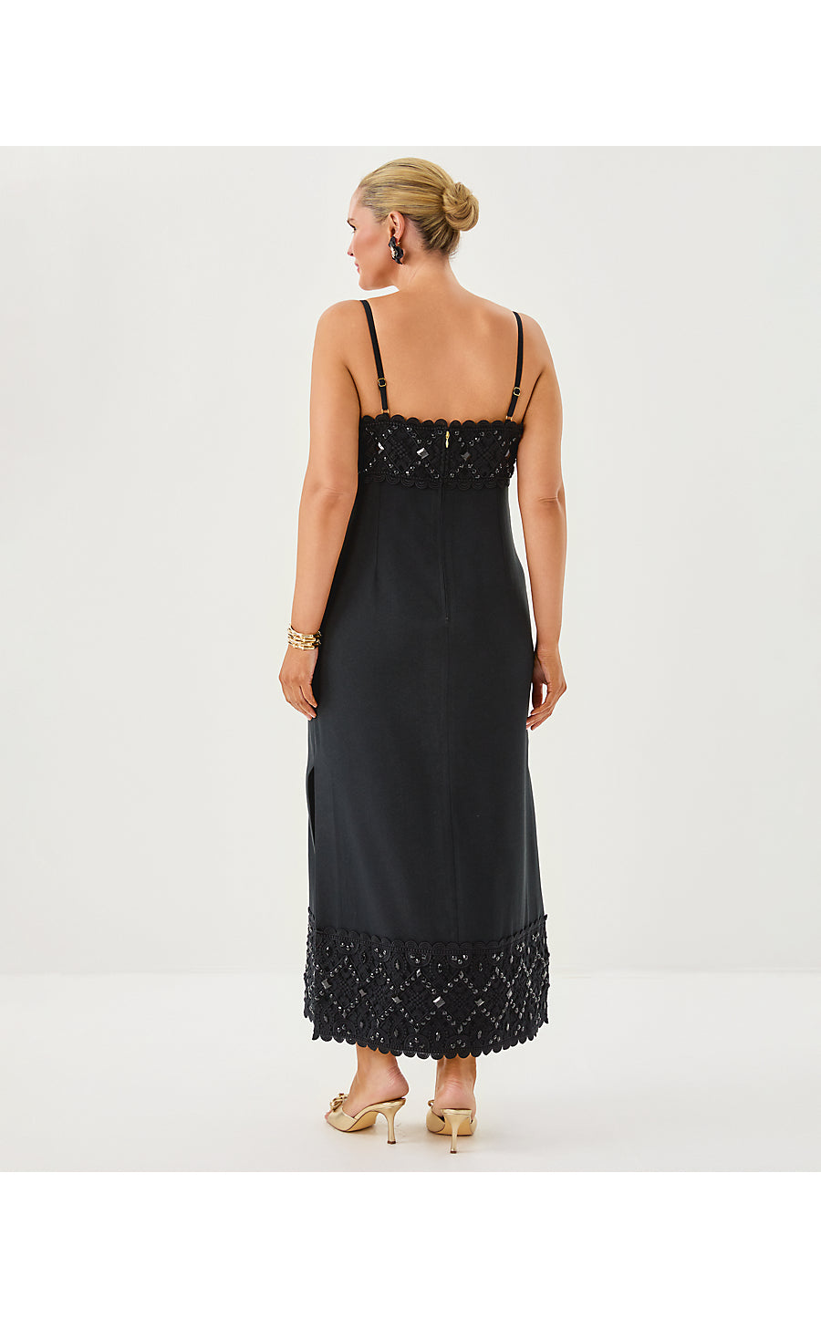 Vena Maxi Dress- Fitted, square neck maxi dress with adjustable spaghetti straps, bodice cups, side slits, and wide Lilly lace trim with beading.