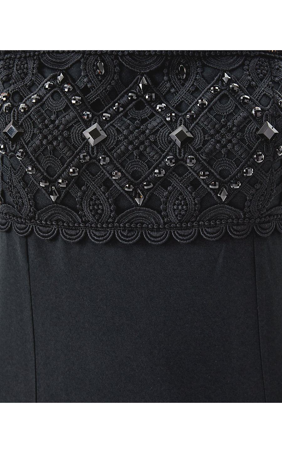 - Fitted, square neck maxi dress with adjustable spaghetti straps, bodice cups, side slits, and wide Lilly lace trim with beading.