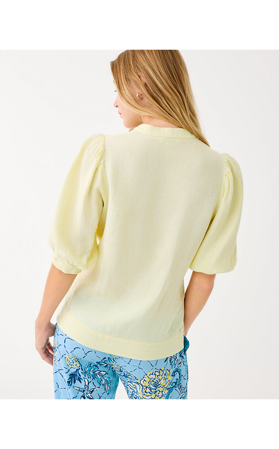 • Easy fit top with a collar and elbow-length puff sleeves.