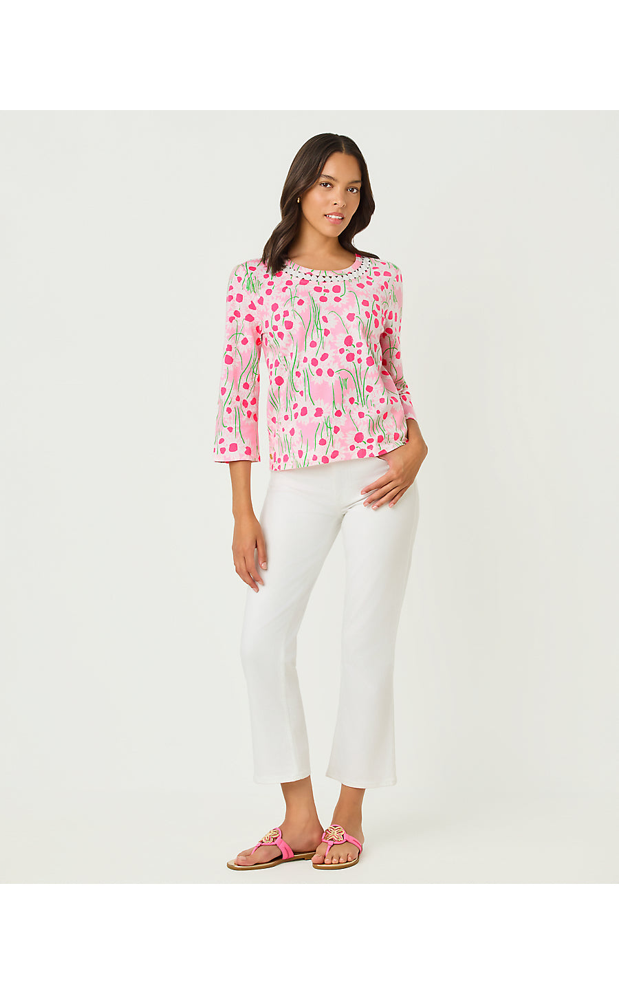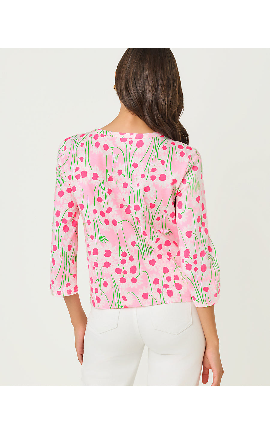Clairmont 3/4 Sleeved Trimmed Top - Conch Shell Pink Lil Sunny Daisies