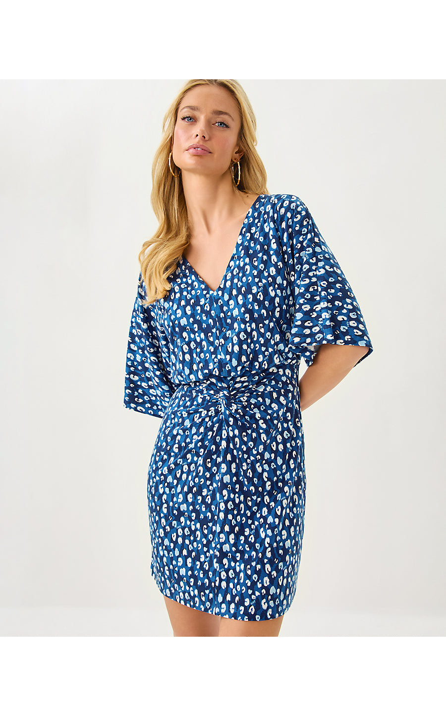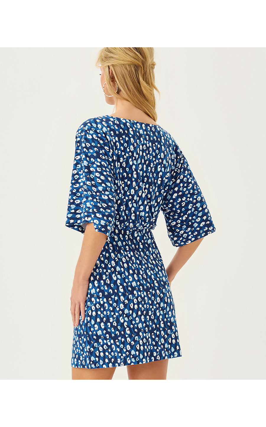 - Straight fit, mini dress with a v-neckline, elbow-length kimono sleeves, and a twist-front skirt.