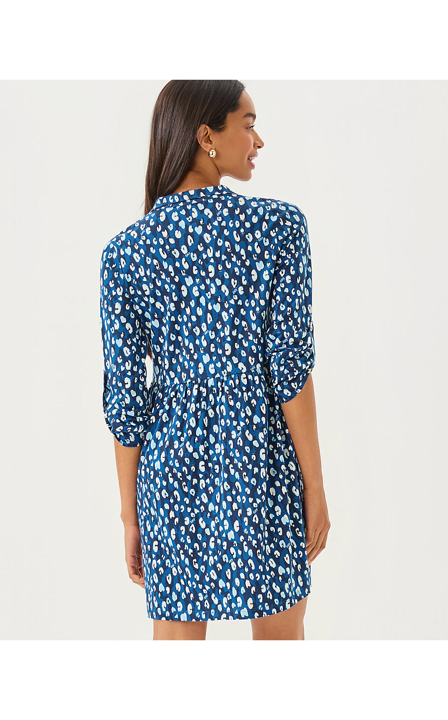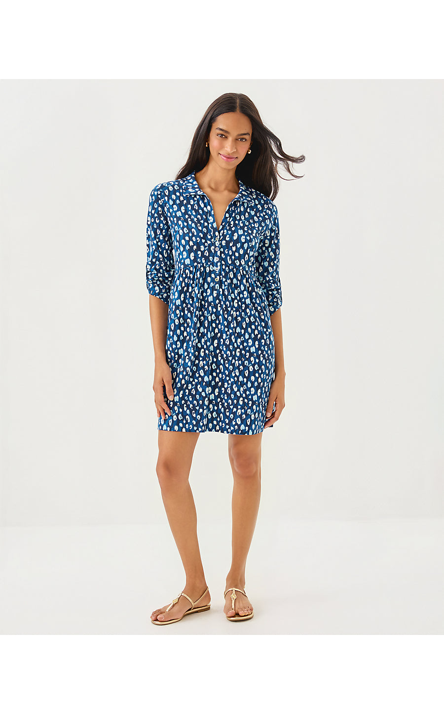 Saralyn Popover Shirtdress- Swing fit, popover shirtdress with a half placket, gold buttons, and 3/4 length sleeves with button roll tabs.