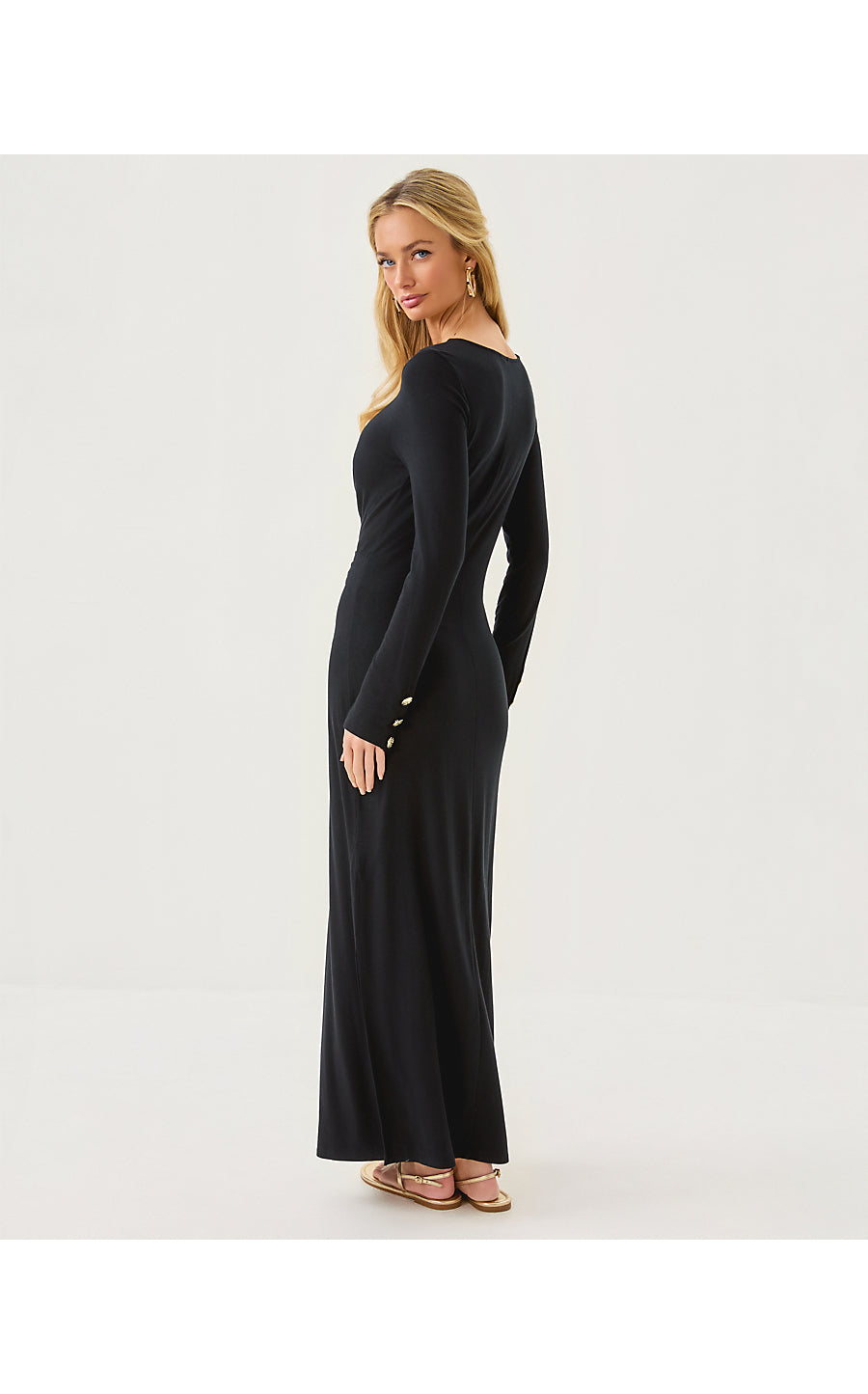 - Fitted, crew neck maxi dress with a faux wrap bodice detail, long sleeves with large gold buttons, and side slits.