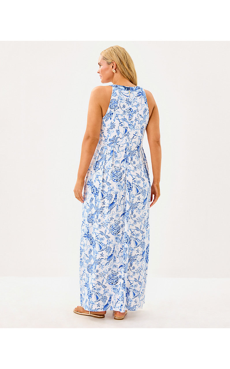 - Fit-and-flare, v-neck maxi dress with cut-in armholes, removable bodice cups, and printed bands at the front neckline