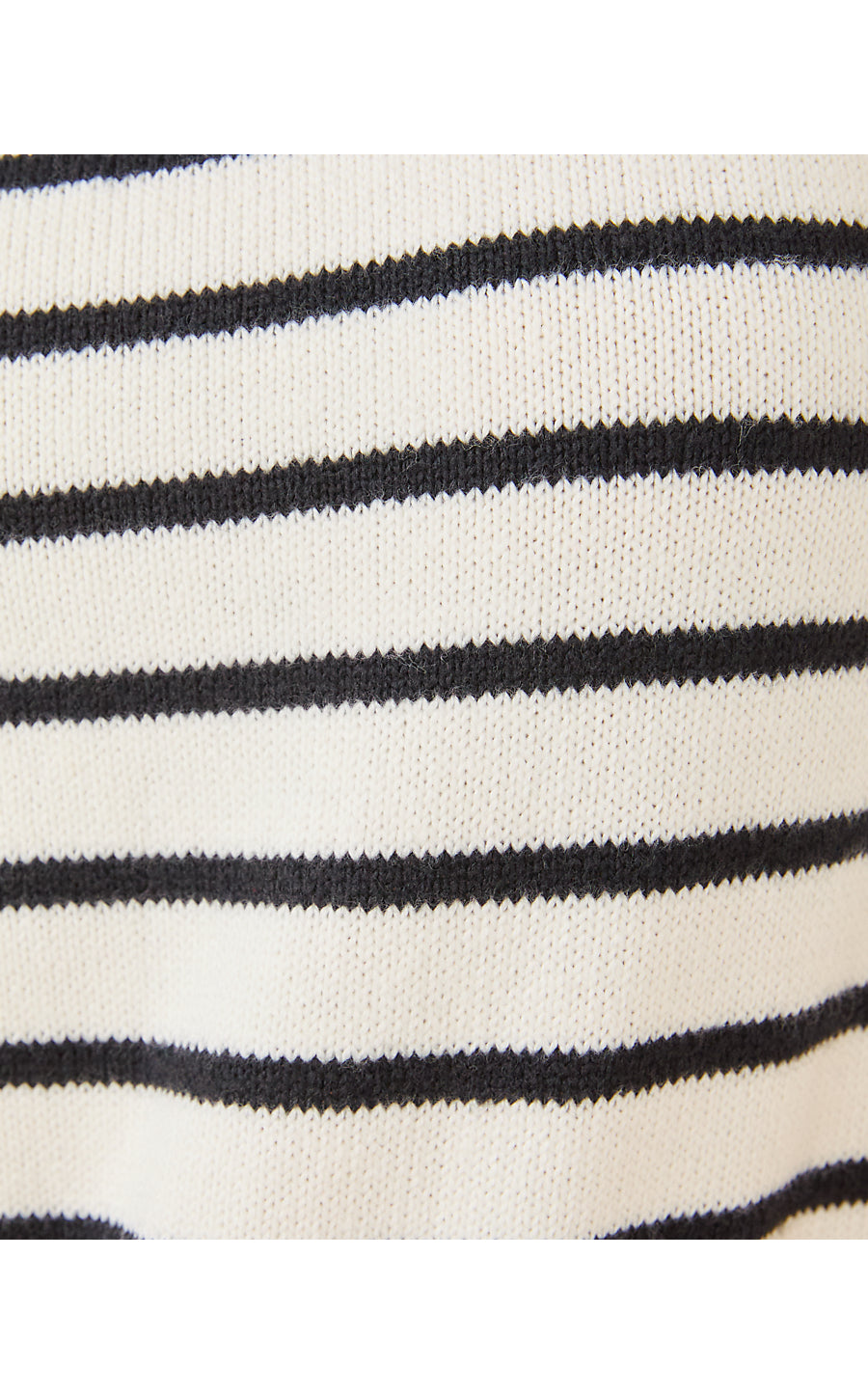 - Striped, crew neck cardigan with buttons and a matching crew neck shell.