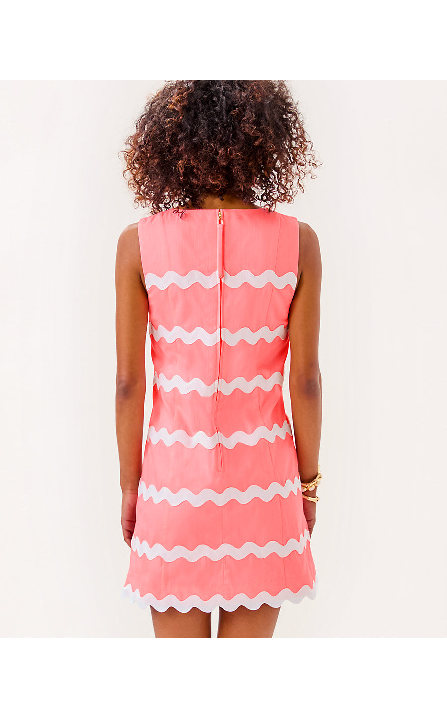 • Sleeveless shift romper with top applied ric rac trim and princess seams.