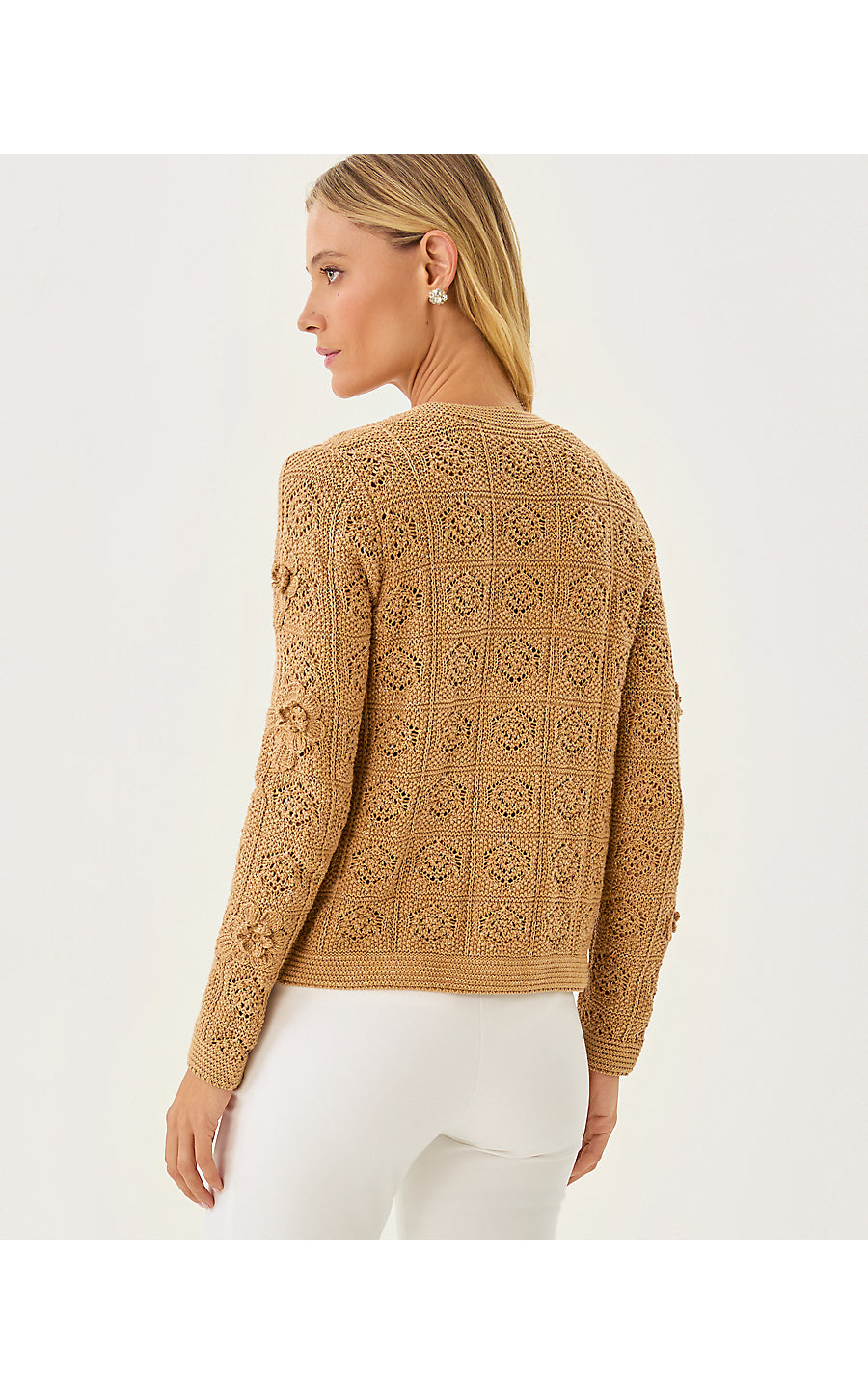• Long sleeve, crew neck cardigan with buttons and allover crochet-like stitches.