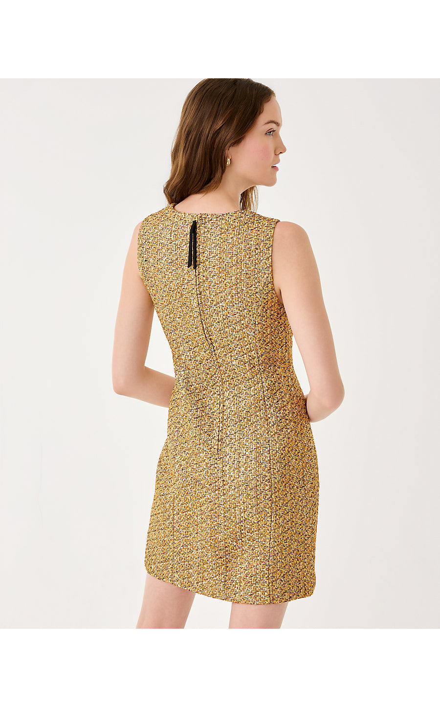 Ritzy Boucle Shift Dress- Fitted shift dress with a contrast front bow detail.