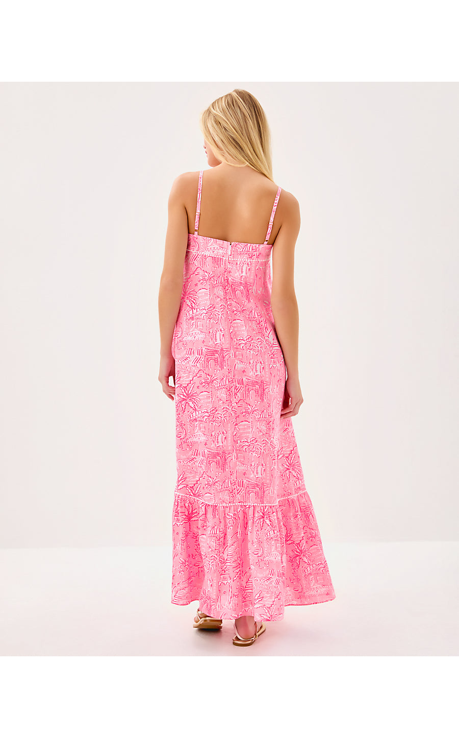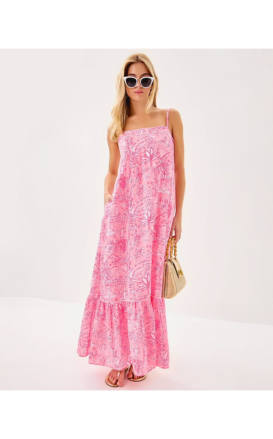 • Swing fit, embroidered maxi dress with adjustable spaghetti straps, interior shelf bra, and pockets. This style also features a tall hem ruffle and Lilly lace trim.